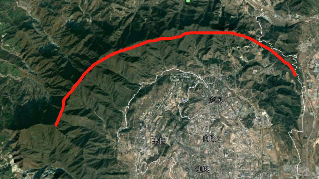 我们将沿着大房山山脚捋一遍,路线的一大部分,形状也呈弧形,与山脊的走向基本平行。