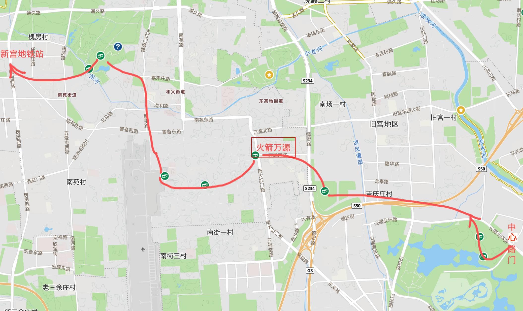 全程较长,各人可以选择在适合的地点结束,其中火箭万源位于路线中点的地铁站,最适合中途结束。有兴趣的可以继续到南苑森林公园最后到新宫地铁站。