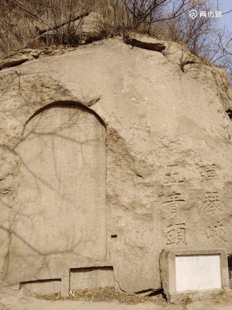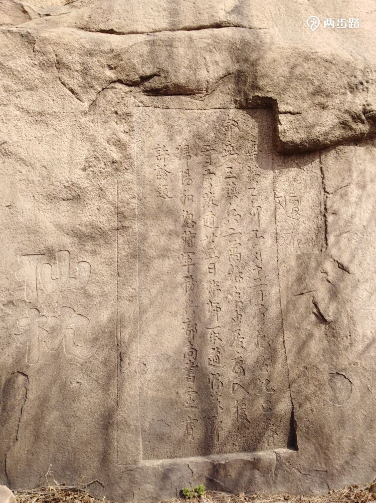 此后,走了段河床,继续轧马路,经上关、石化山庄,遇仙枕石,见嘉靖年间兵部尚书灵宝驱虏班师勒石刻字。石有浅阶可登,上有旗杆洞。