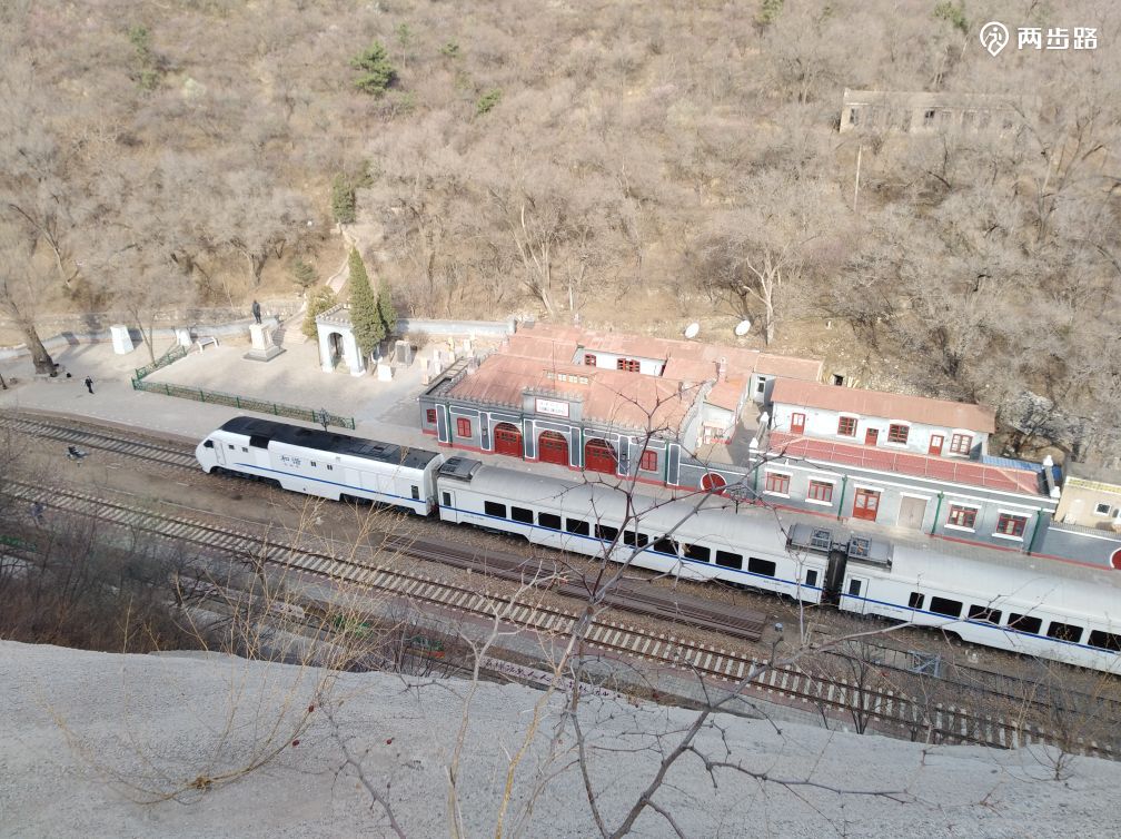 此地有两条轨迹通水关长城,一条在“红叶岭”刻石处,一位老大娘看守着,另一条需进陵园大门,近车站时右侧上山,从围栏薄弱处通过。向右似亦可通长城,向左登高可俯视青龙桥车站。时值沙城方向来车进站,众人站到一块突出的大石头上拍照。