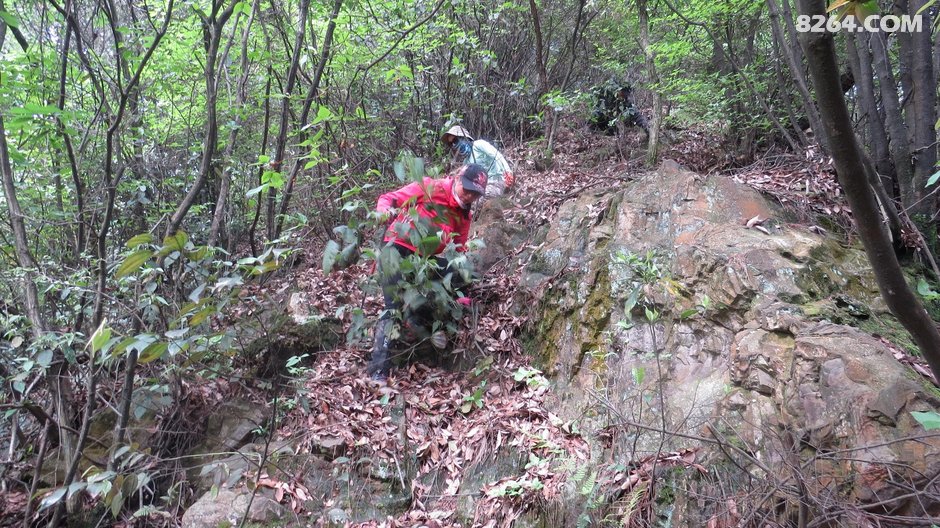当我们来到这个山谷最后一个岔路时,大家都觉得要开始上升了,向左向上,起初是小路,最后小路消失了,就只有直接钻了,好在没什么刺篷。我知道这里是明灯山,我们要做的是在明灯山南麓穿过去,今天上升的一个大的原则是不能登顶明灯山,因为,一旦登顶了,如果视野不好的话,很可能越过山脊,去过了山北边的平地,那就离我们的目的地羞女峰更远了,更主要的是,赶不到饭点了。今天大家都奔着午餐有人请客去的,所以,没带路餐。