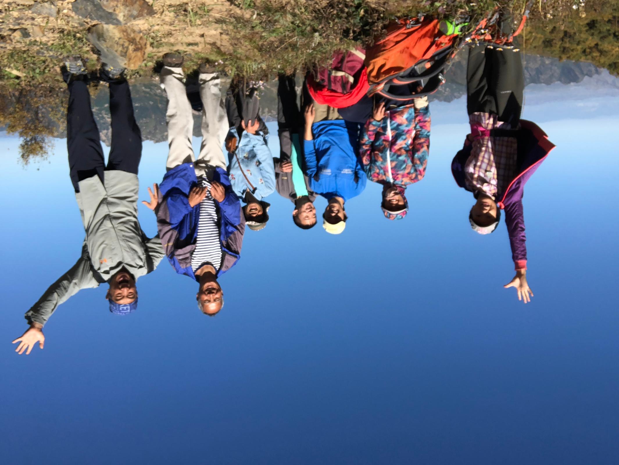 9:45到江水河,跟着逛逛。里程挺短,时间充裕,空气清新,也就不打算抄近道了。一直沿着柏油盘山路往上走。后面突然有人叫:停一下!一回头,老张、阿四火和图图出现在身旁,像变魔术似的。原来,他们在洪水口往江水河走的半公里处遇到老独,老独跟他们的车上来了。不过,在碰到我们之前,老独已经下车。老张立马开车返回接老独。10:35,两个课题组的人汇合了。老张跟自带光芒似的,比上次见年轻,帅气,一定不是因为他让我们课题成员提前汇合的原因,也许是清晨阳光实在漂亮。图图和我是老乡,也是此行两个课题中,我唯一没有见过的,这回也由线上走到线下,完成由网友到山友的转变,阿四火给我俩照了张合影。王山而膝伤刚好不久,转向图图课题,本课题组其余7人,向灵山进发。