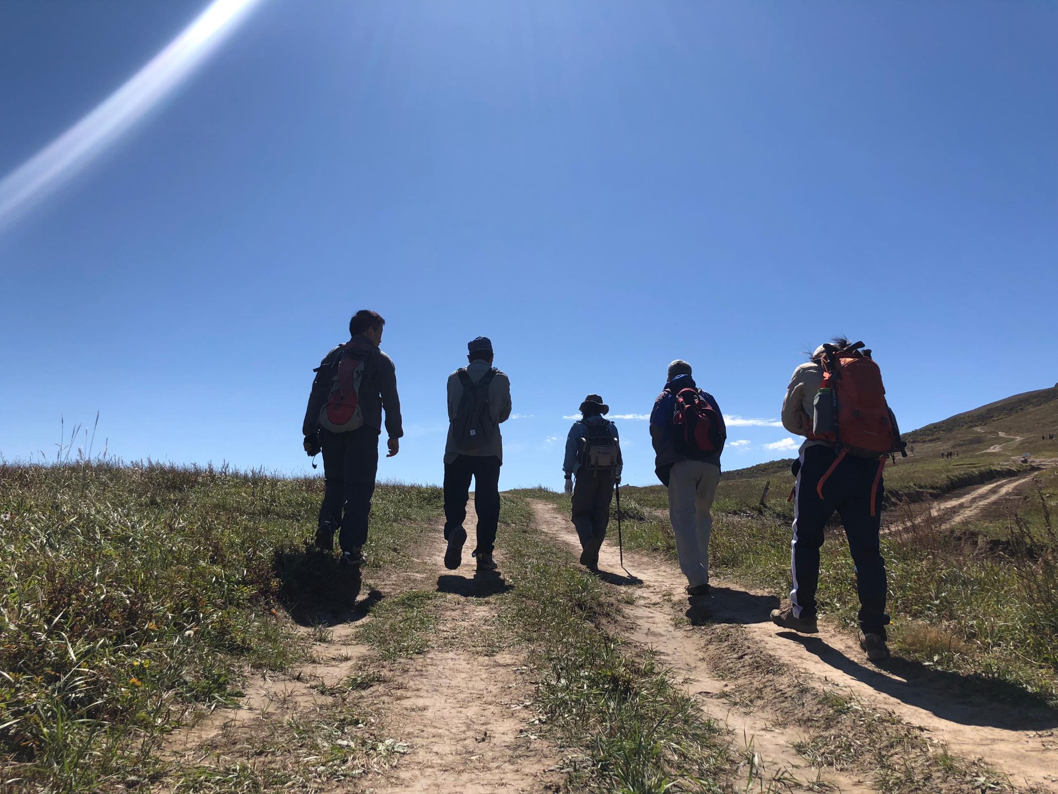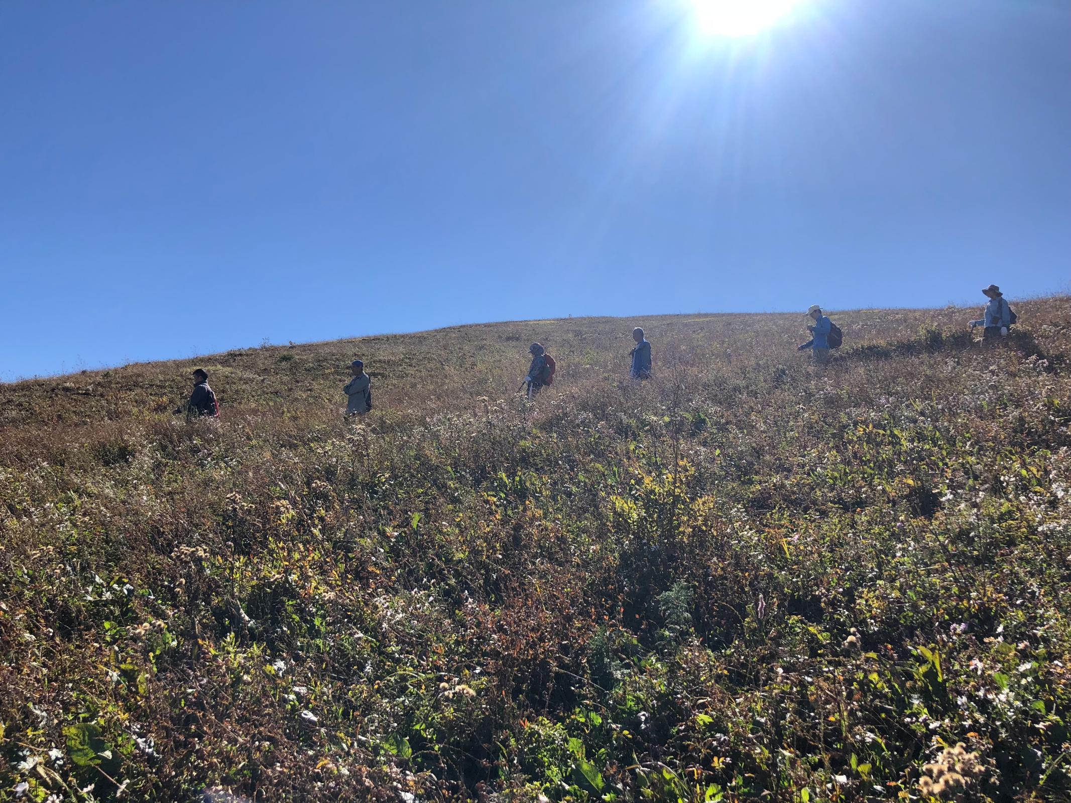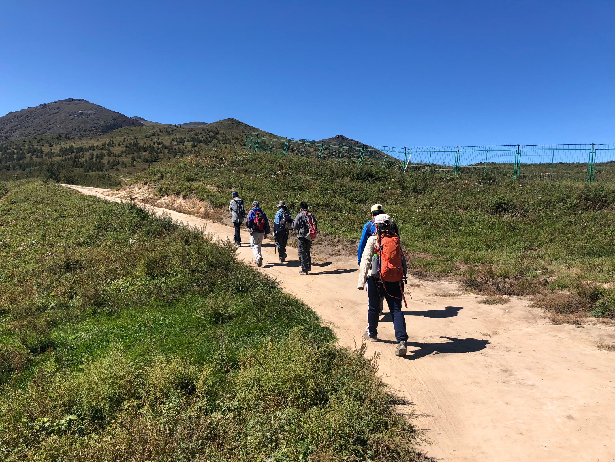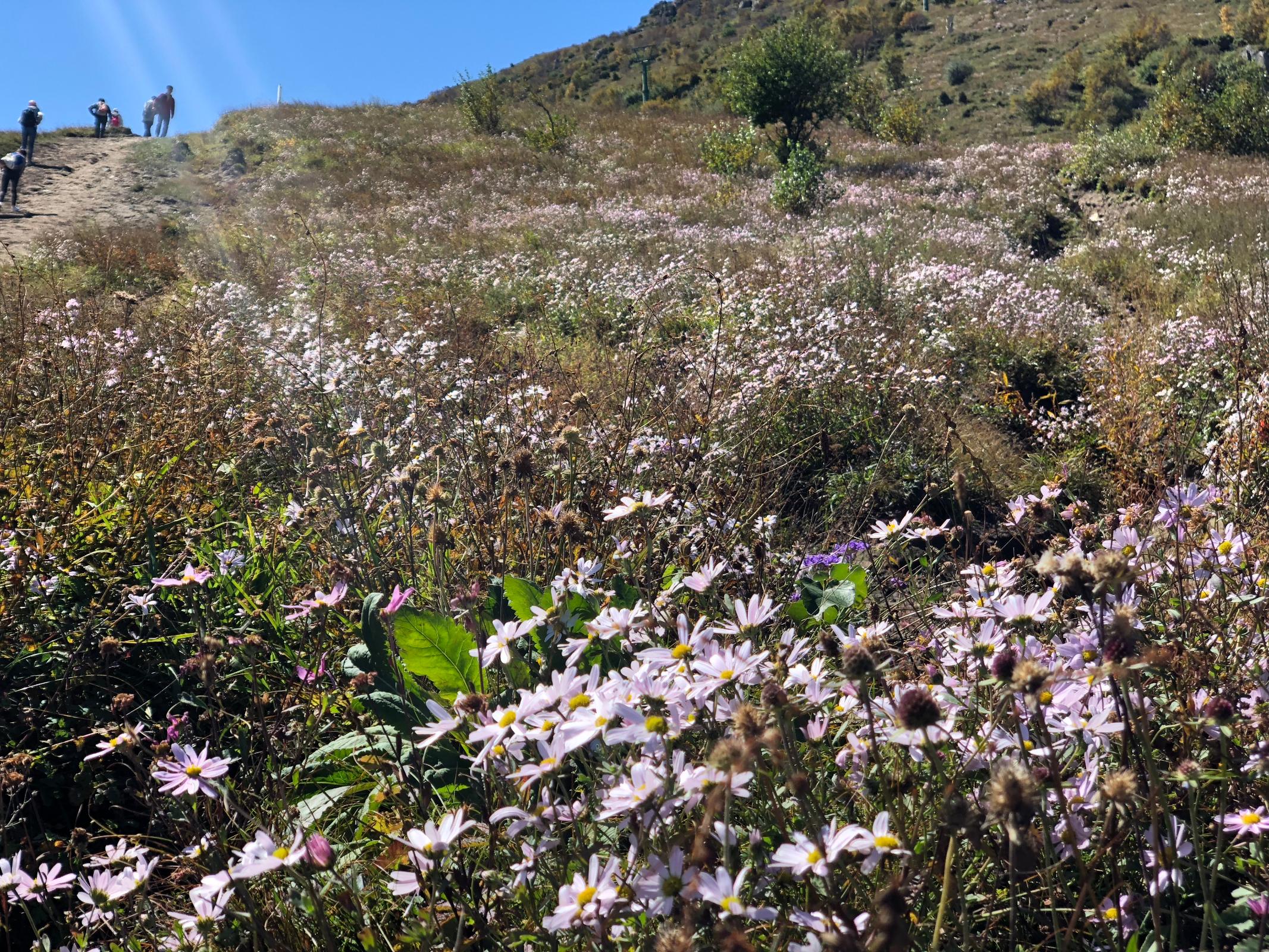 视野真开阔。漫山野花,跟春天一样开得热热闹闹的;远处的树林开始变色,有点秋天的意思。7个人时而一起时而散开,但都在视野里,这种地方,想丢一个人都难。一开始看不见灵山的山顶,等看得见灵山山顶的时候,基本上就快到跟前了。枫树的腿有点不舒服,再说他和胡林登过几次顶了,他俩选择在山坡栈道上晒太阳。其他5人1点登顶。