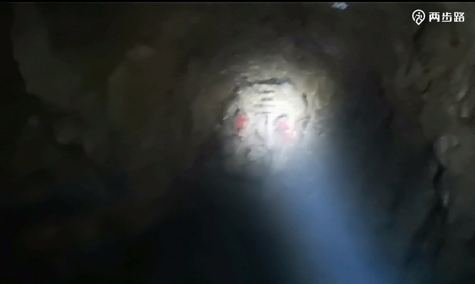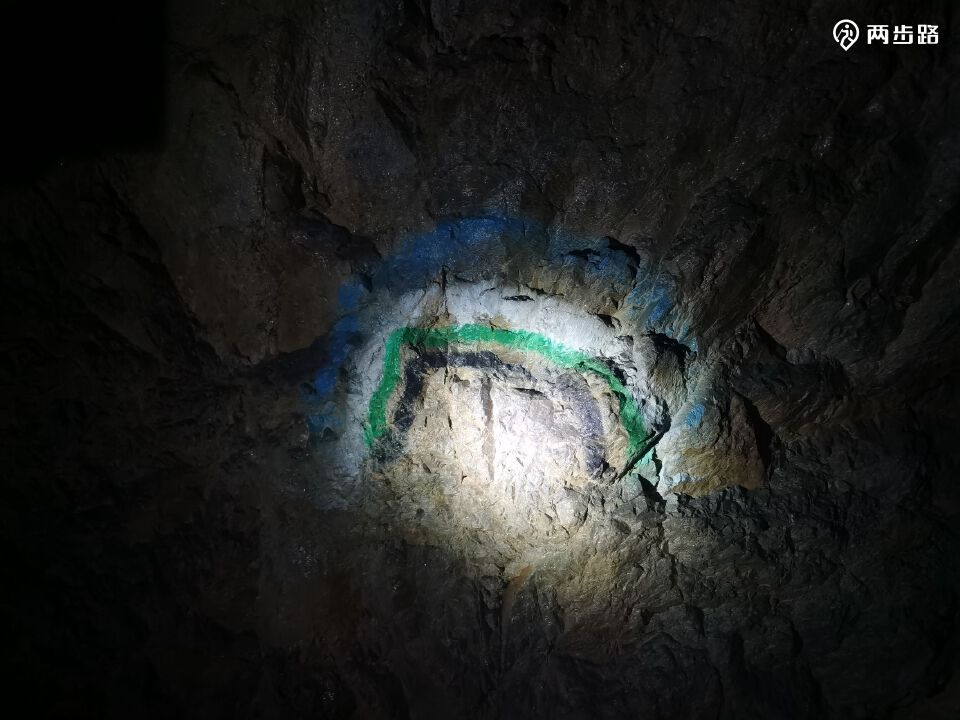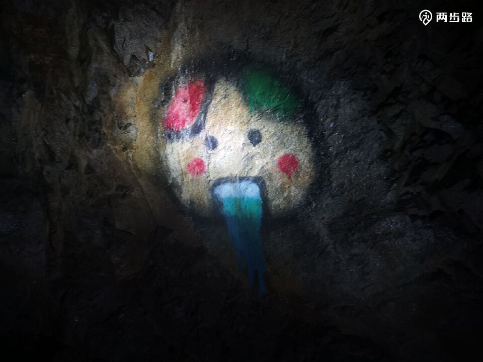 这次是有备而来,我们带了强光手电,这次看清楚了,只有一条主干,宽约2-3米,高约3米,两侧分支都是死胡同,右侧第一分支通到一个天坑,也算是死胡同,主干的确是斜穿了山体,全长约350米,另一个洞口位于主峰东侧,两个洞口基本上位于同一高度,地面大致平坦,主干距西南口30米处地面略低,有一段长度约4米的积水,水深仅到鞋帮的1/3,鞋未进水,右侧第一支洞也有积水,壁上写着“清风队到此一游”。除这一处字迹,还有四幅图画,分散在不同的支洞中,给几百年后的考古学家提供了研究课题。