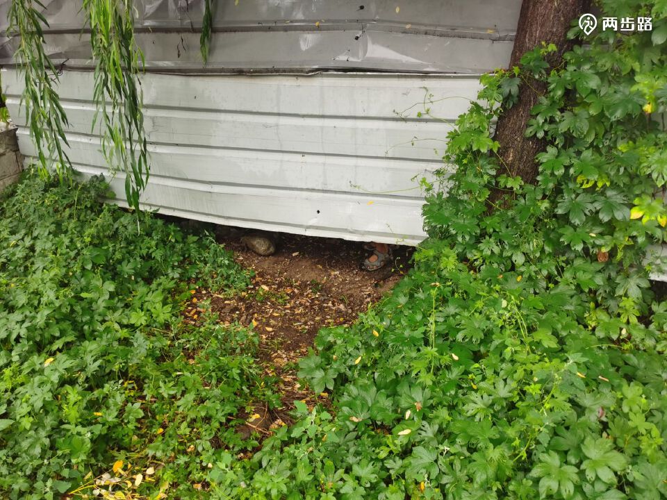 闲逛逛带我们走了一段修在山上的水泥路,这是房山煤矿连接不同生产生活办公区域的通道,现在路两侧的坡地都开垦成菜地,路通往一个凉亭,一对男女正在纳凉,凳子上摆着放在塑料袋里的小菜,还有啤酒,点着蚊香,亭子下方,沿着山坡有一道台阶路,路的终点是一个月亮门,有铁丝网把门封了。但没有什么能够阻挡贵社的前进,因为铁丝网上已经被热心群众撕开了一个大洞,比八十亩地围挡的狗洞大得多,我们通行的姿势可以更优雅。