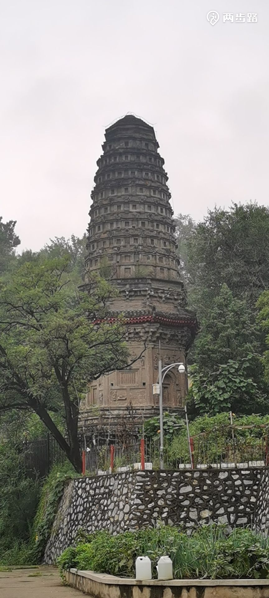 高处的花塔倒是可以靠近的,他们三个人去塔基瞻仰,我懒得过去,坐着等他们。花塔旁边是房山煤矿的一座居民楼,从形制上来看,似乎最初是办公楼,但现在无疑已经改变了用途,外墙上爬满了爬山虎,几位白发的奶奶坐在小椅子上,摇着扇子,闲聊着什么,让我想起“白头宫女在,闲坐说玄宗”。