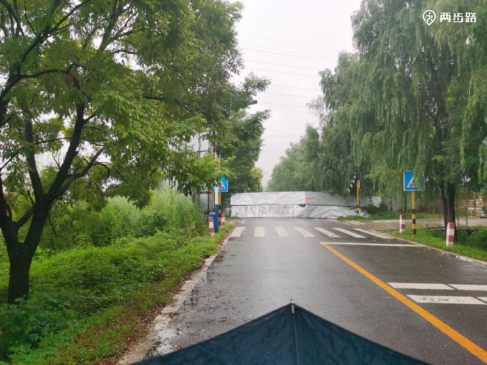围挡后面这一段,路两侧是波隆葡萄酒庄园酒床的地盘,波可能是致敬波尔多,隆是致敬哪个葡萄酒产地?前面就是八十亩地村,徐老师畅想着午餐要在村里的小馆子解决,然而从村头穿到村尾也没看到一个饭馆,除了利用村委会屋檐下的雨帘把凉鞋好好冲洗了一番,没有别的收获,羊南路在八十亩地村的北出口是一个桥,也用栅栏门封了,但旁边河道可以绕行。