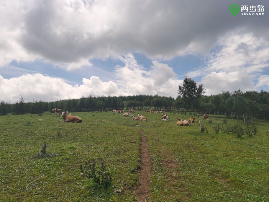 我们从龙潭开始看到零星的牛,到了龙潭岭山脊上,开始与大群的牛相遇,脖子上拴着铃铛,悠然自得地或站或躺,细嚼慢咽着嘴里的草。牛铃大小不一,音色和音调各异,叮呼地呼应着,仿佛一场草地音乐会。