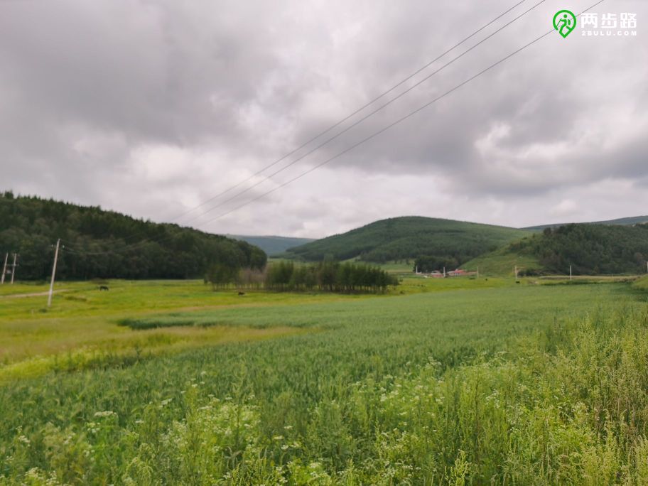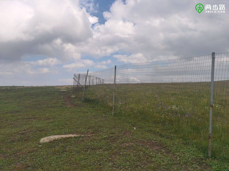 我们沿着草坡上的小路缓缓上升,太阳在云间时隐时现,山坡上还用粗铁丝拉起的围栏圈起来一块农田,种着莜麦。围栏是用来阻挡牛的。
