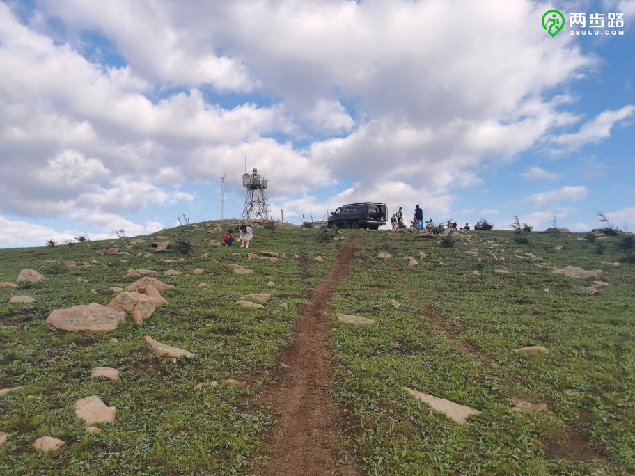 西侧的峰顶有一个通讯基站,山坡上站着几个摩托骑士,他们的摩托车躺在草地上。其中一个人认出了我们,一个小时前,骑着越野摩托如一阵风从旁边掠过,在崎岖的陡坡上跌宕,绝尘而去的,就是他。他们旁边还有一辆大型越野山,挂着鲁地的牌照。居然还有两个小女孩也在他们中间。