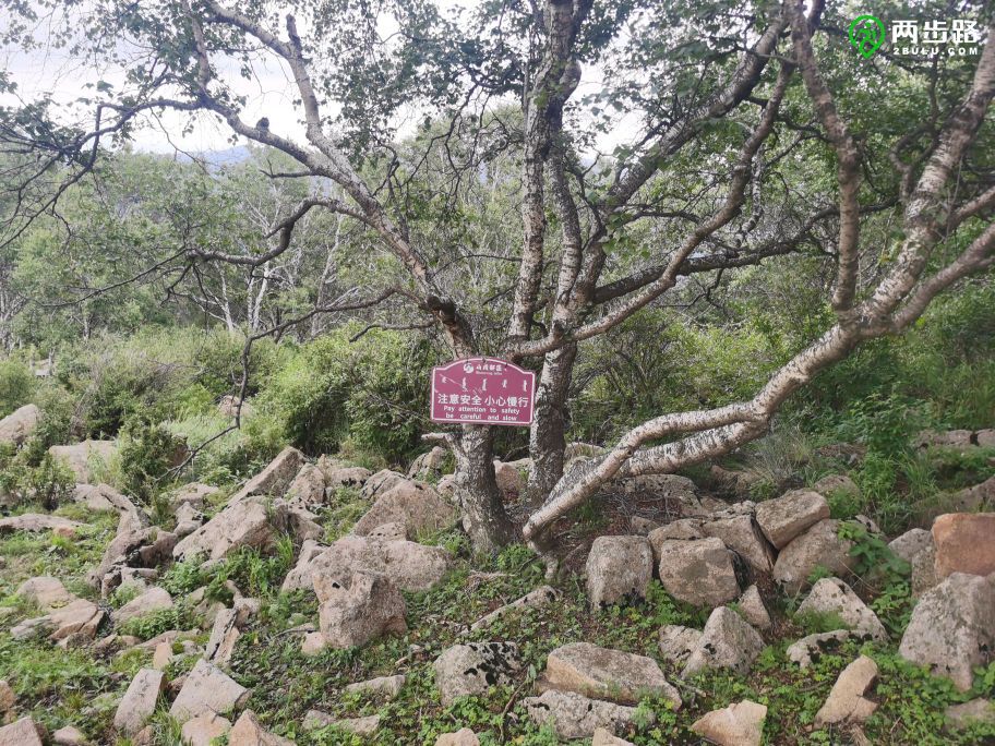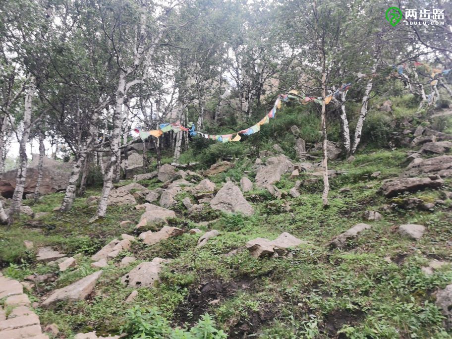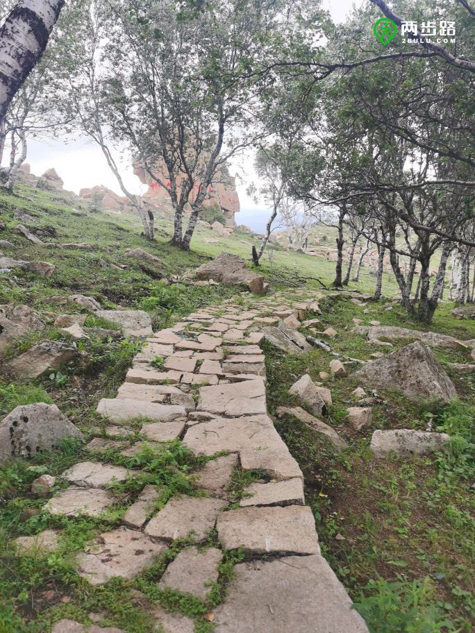 棒槌后面的树林里拉着经幡。我刚刚预言过这里迟早会被开发,绕到石头后面,马上就应验了,一条石板路蜿蜒通往树林深处,路边还挂着牌子,提醒游客文明游览,落款是“山戎部落”。