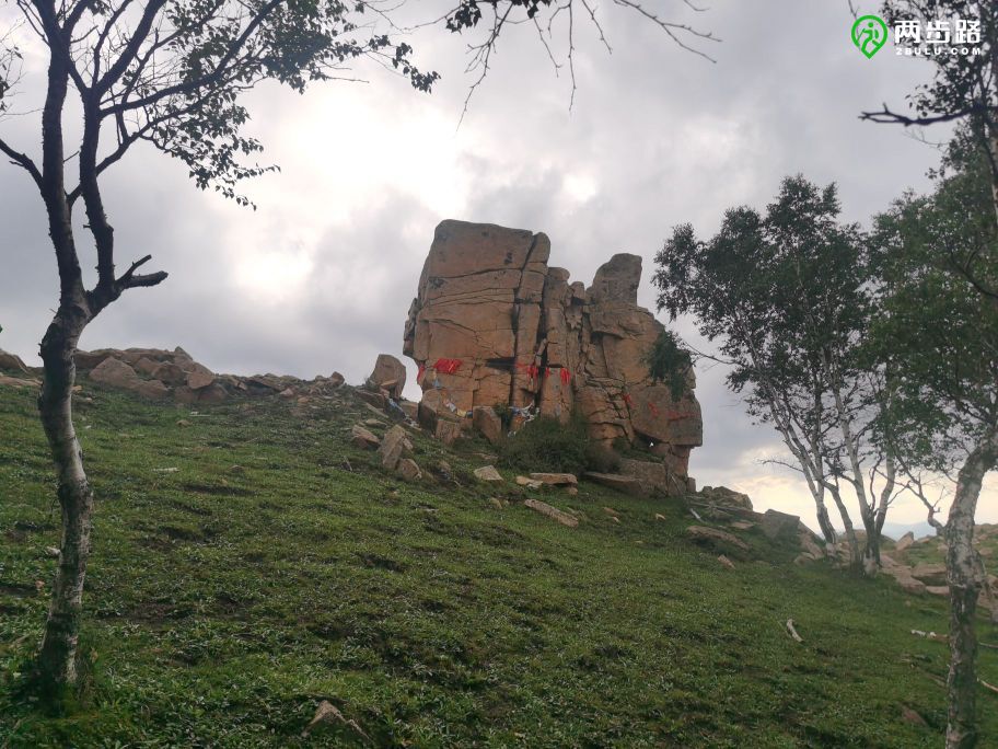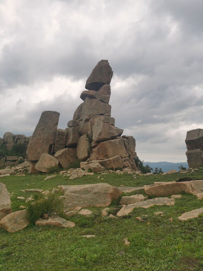 偶有风烛残年的石头杵在山坡上,或者横七竖八躺在一大片空地上,战场的陈尸一般。唯一屹立不倒的是它——被称为棒槌山的一座巨石,高约20米,横向的裂缝已经将它分成几截,但它依然倔强地矗立着,像革命历史题材影片中身中数弹仍不倒下的烈士。这个英雄形象的背景音乐是喋喋不休的藏语经文以及内蒙古地方戏等等,夹杂着风声,这些令人啼笑皆非的音响来自旁边的一块大石头顶上安装的设备,是用太阳能驱动的,今天阳光不强,电力不足,所以经文朗诵呈现出扭曲的滑稽音效,仿佛保存不佳的过期磁带放出来的声音。