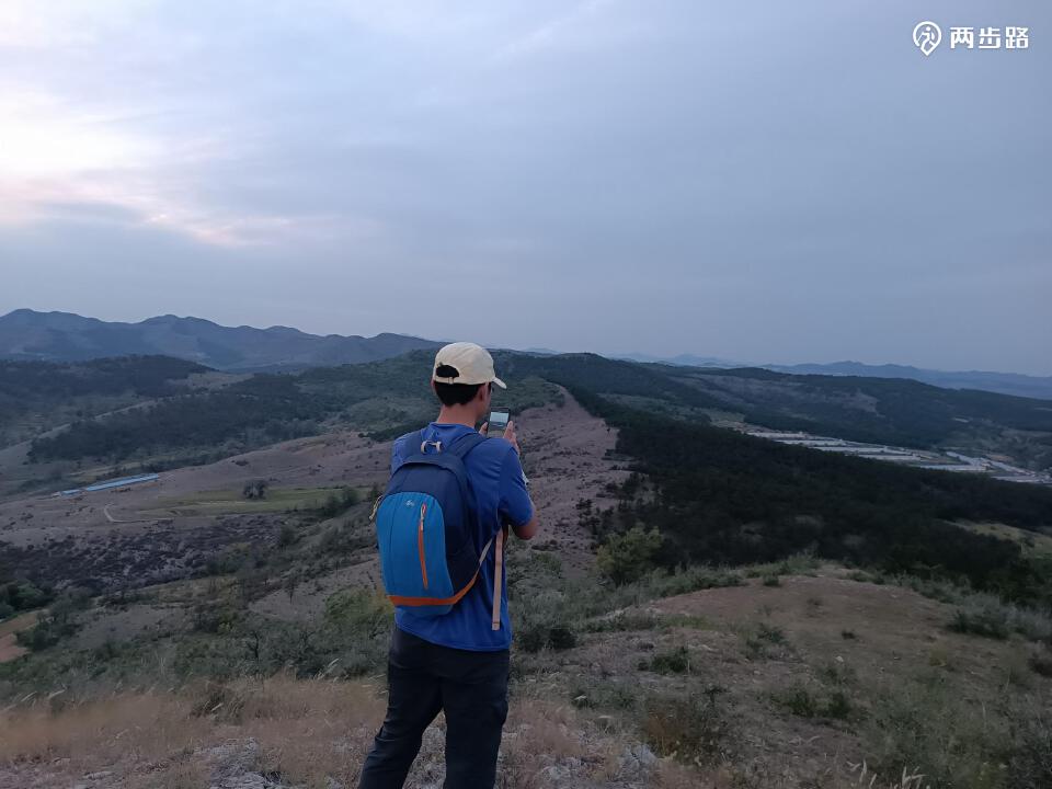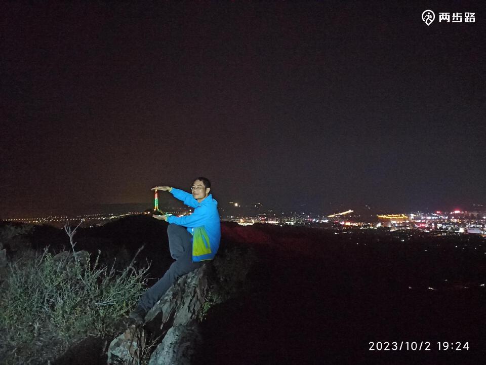 走大路跨垭口,至小城子镇上G306国道,转南柏油路、水泥路,过南湾子,到锅顶山垭口。由此向东攀顶,天色渐晚,沿山脊行走,至草帽山,赏凌源夜景,复入灯火人间。路甚易、草初黄,月高挂、风微凉,山不语、夜正长,城不眠、塔焕光,齐举觞、醉玉堂,出门笑、乐未央。