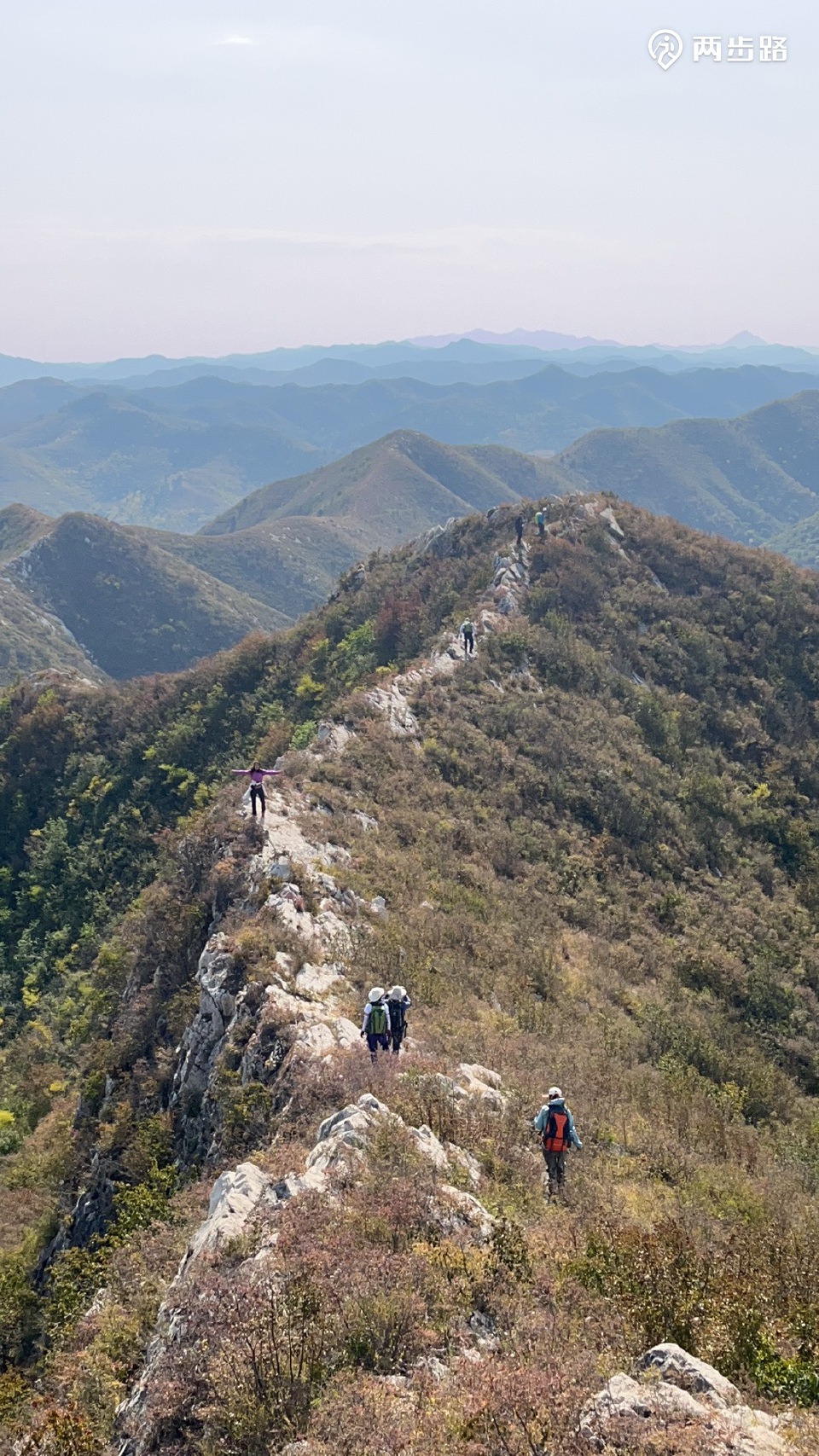 顺山势登上高点黄石砬,山势愈发陡峭,巨石断续、陡崖丛生。再次爬上高点,潘家口水库露出真容,小路渐渐离开主脊,从北边的支脊下降,最终着陆单片五眼楼北的水泥路上。