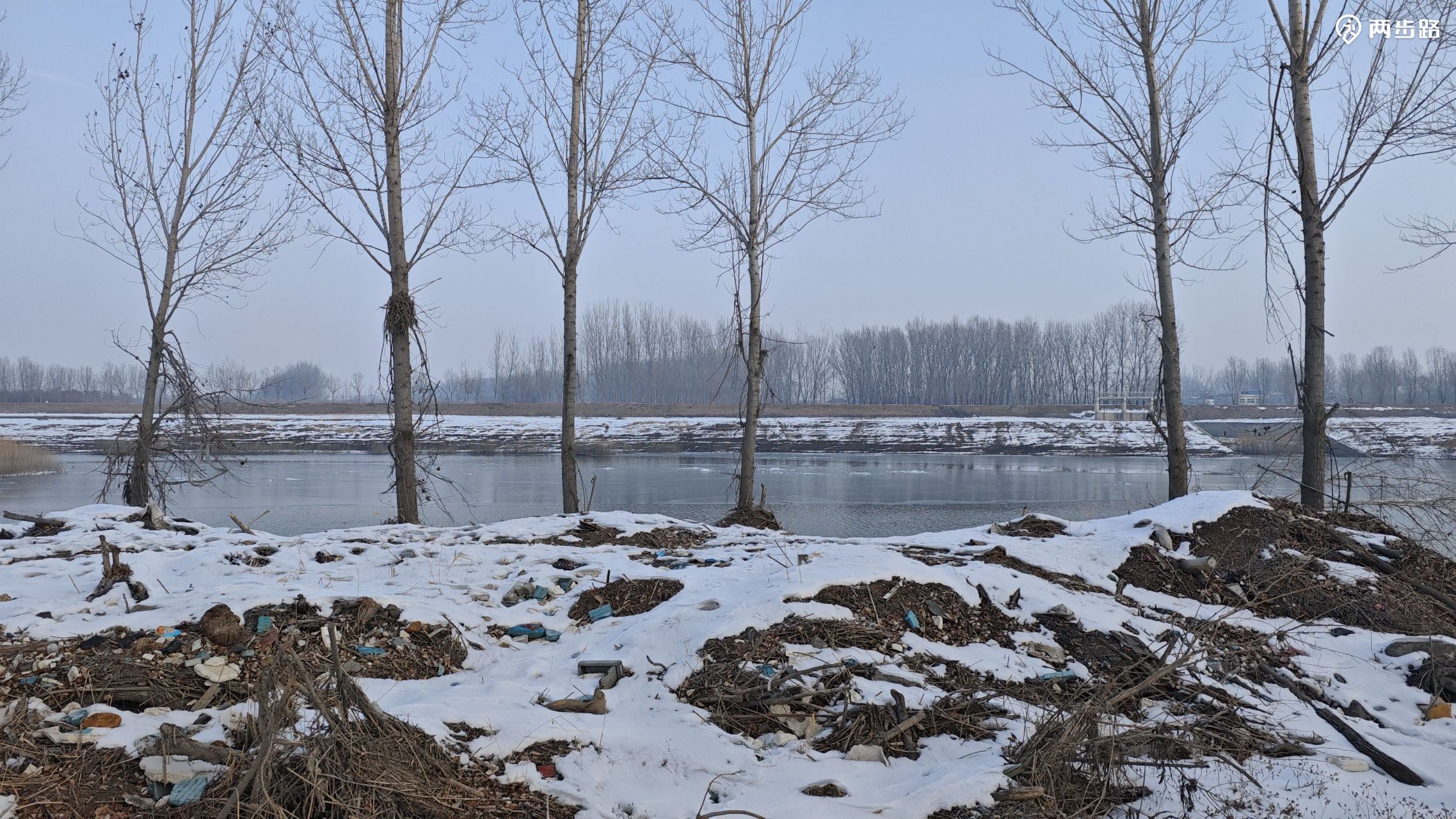 大石河附近树林里形成的湿地和冰面,堆满混乱垃圾的河岸,都是去年洪灾的痕迹。