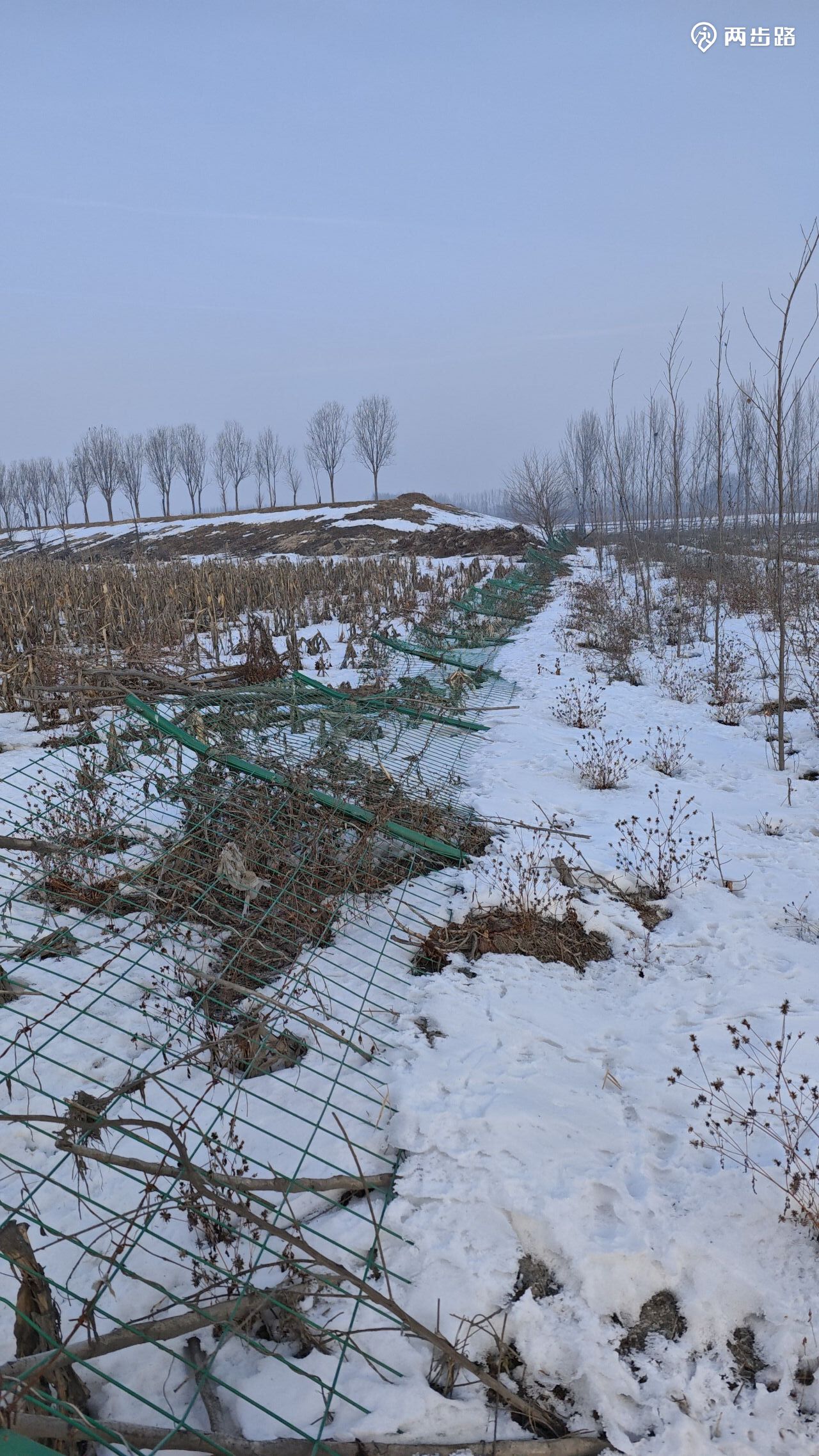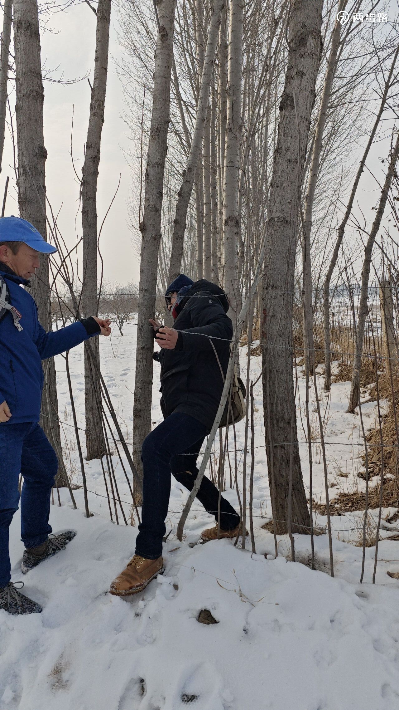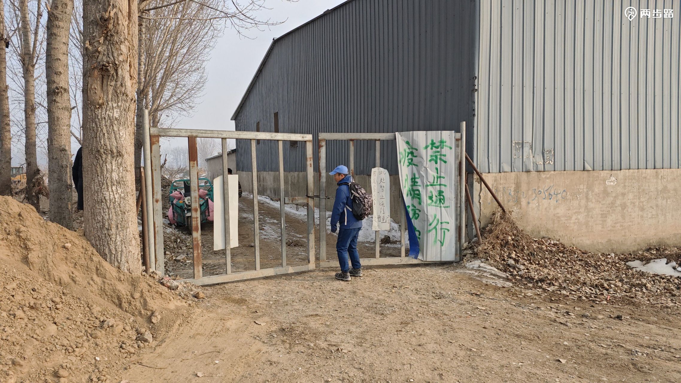 一个年轻人孤零零的站在雪地上,出于好心,试图阻止我们沿着省界前进,理由是前面没有路,防疫期间堆了土作为路障,我问土堆很高,不能爬过去吗?他表示无力解释。后来我们也始终没遇到他所说难以逾越的障碍。