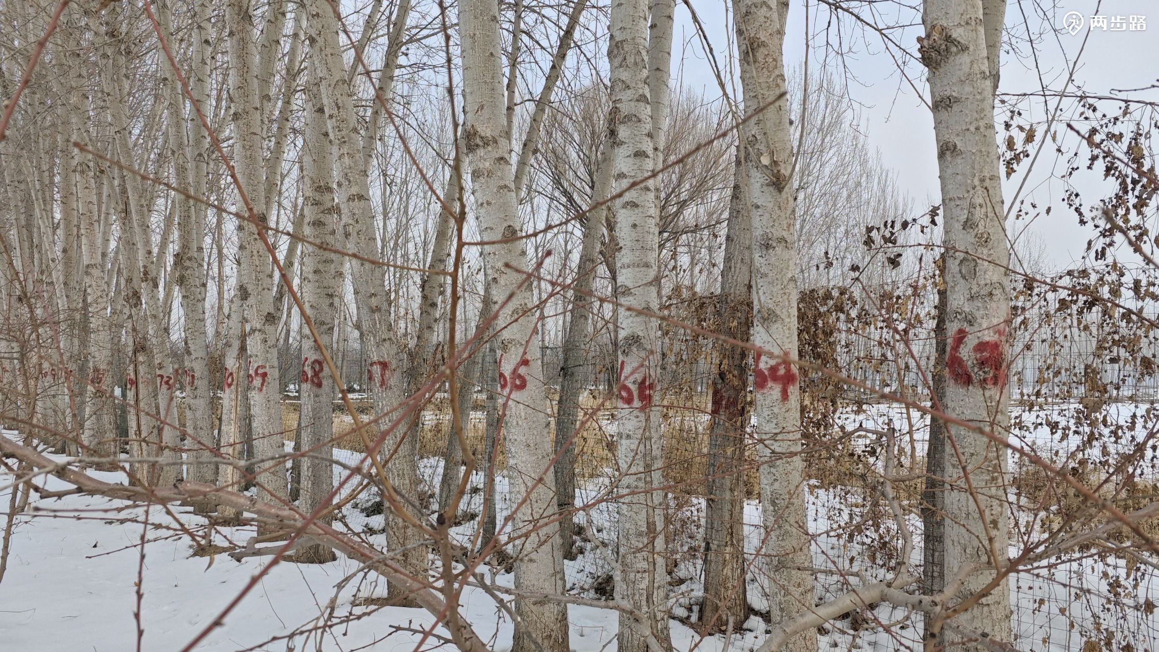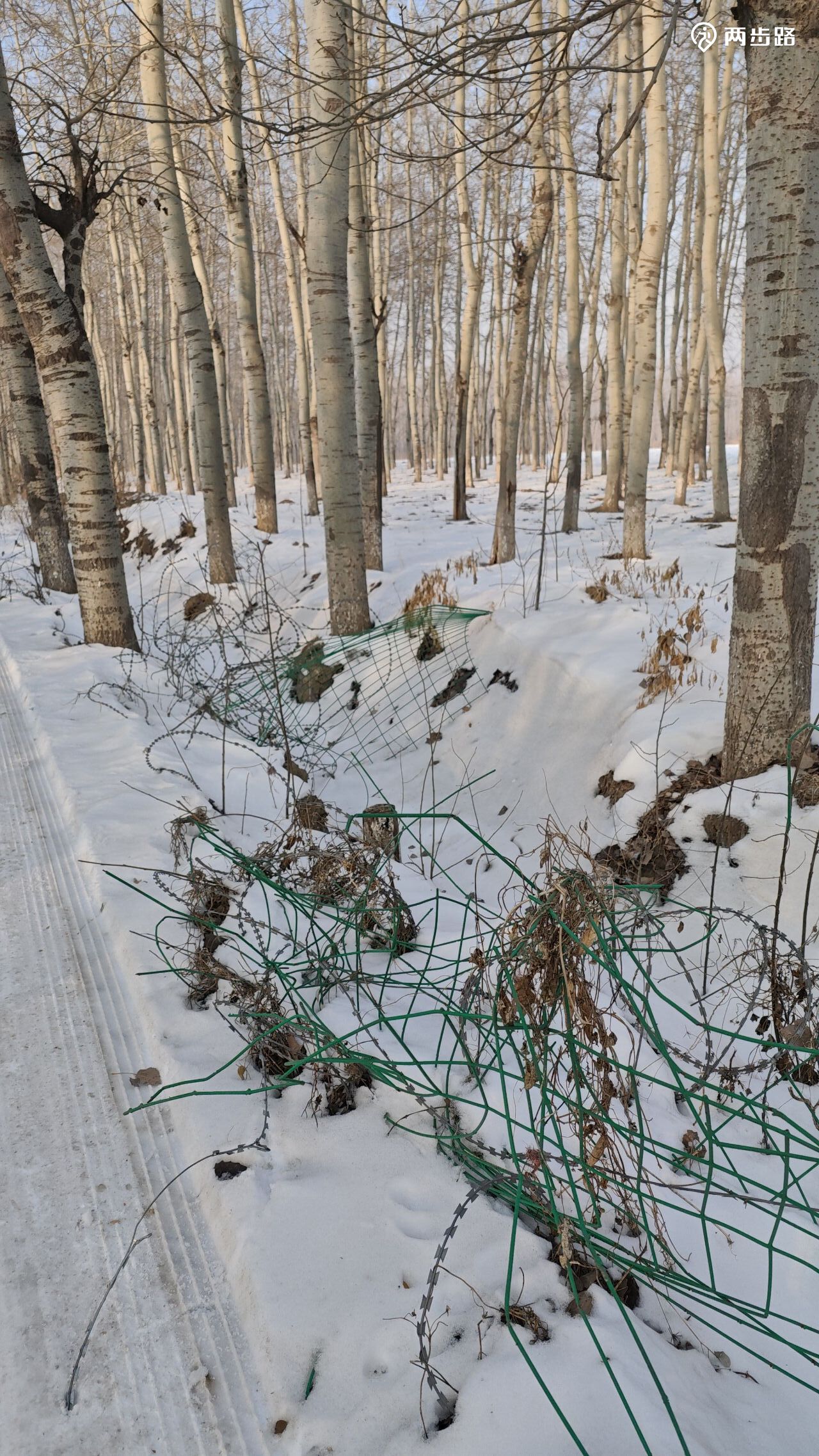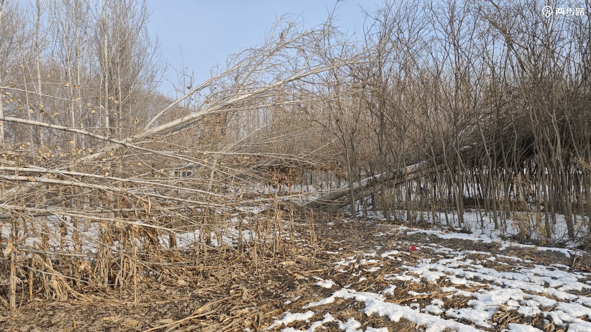 一个年轻人孤零零的站在雪地上,出于好心,试图阻止我们沿着省界前进,理由是前面没有路,防疫期间堆了土作为路障,我问土堆很高,不能爬过去吗?他表示无力解释。后来我们也始终没遇到他所说难以逾越的障碍。
