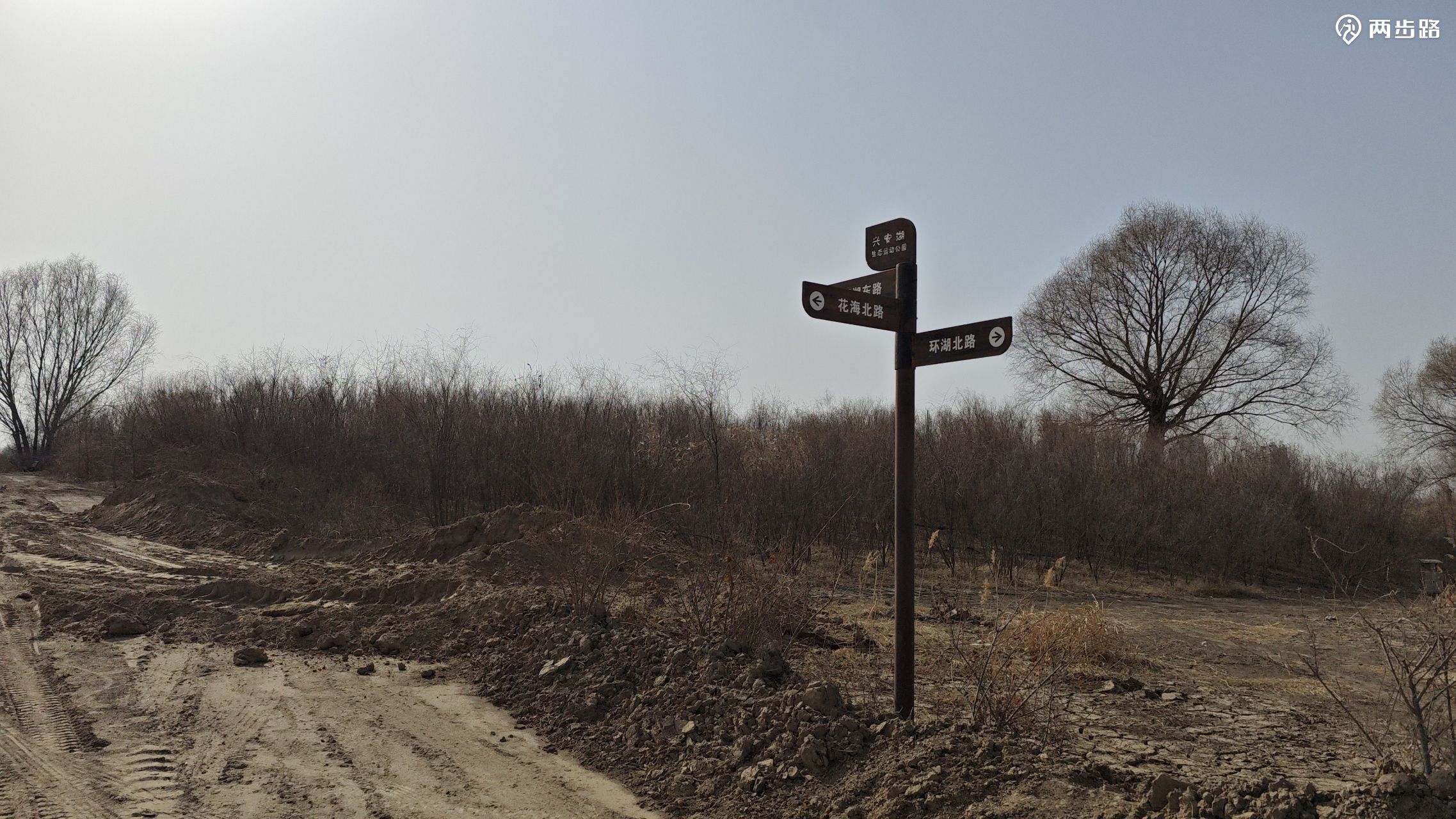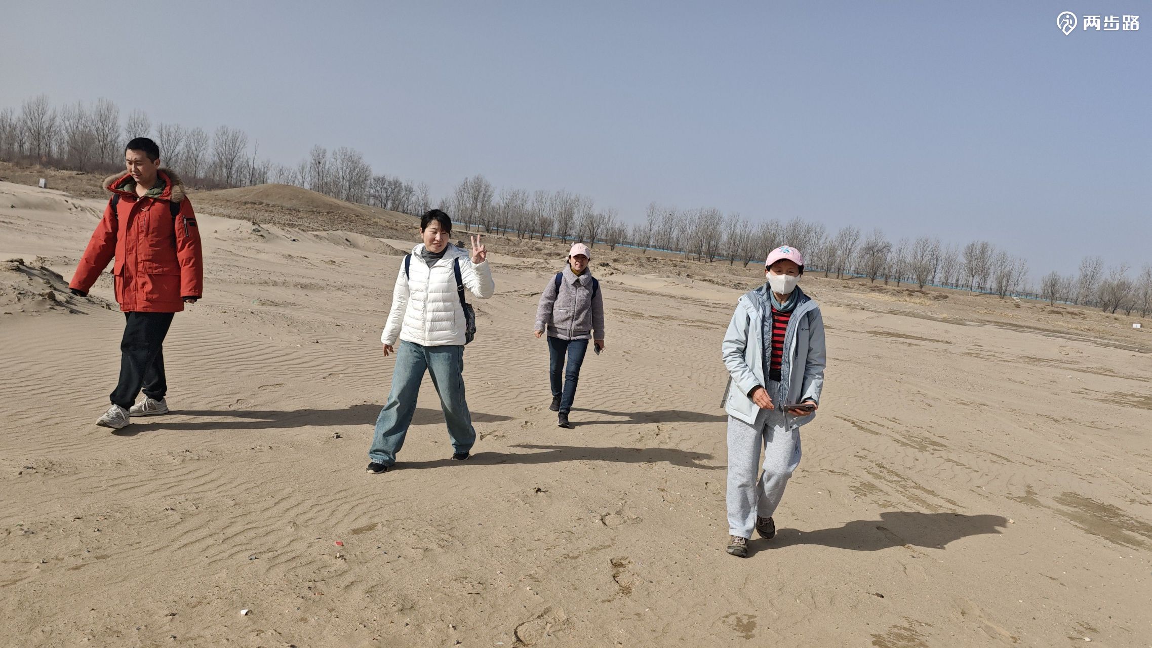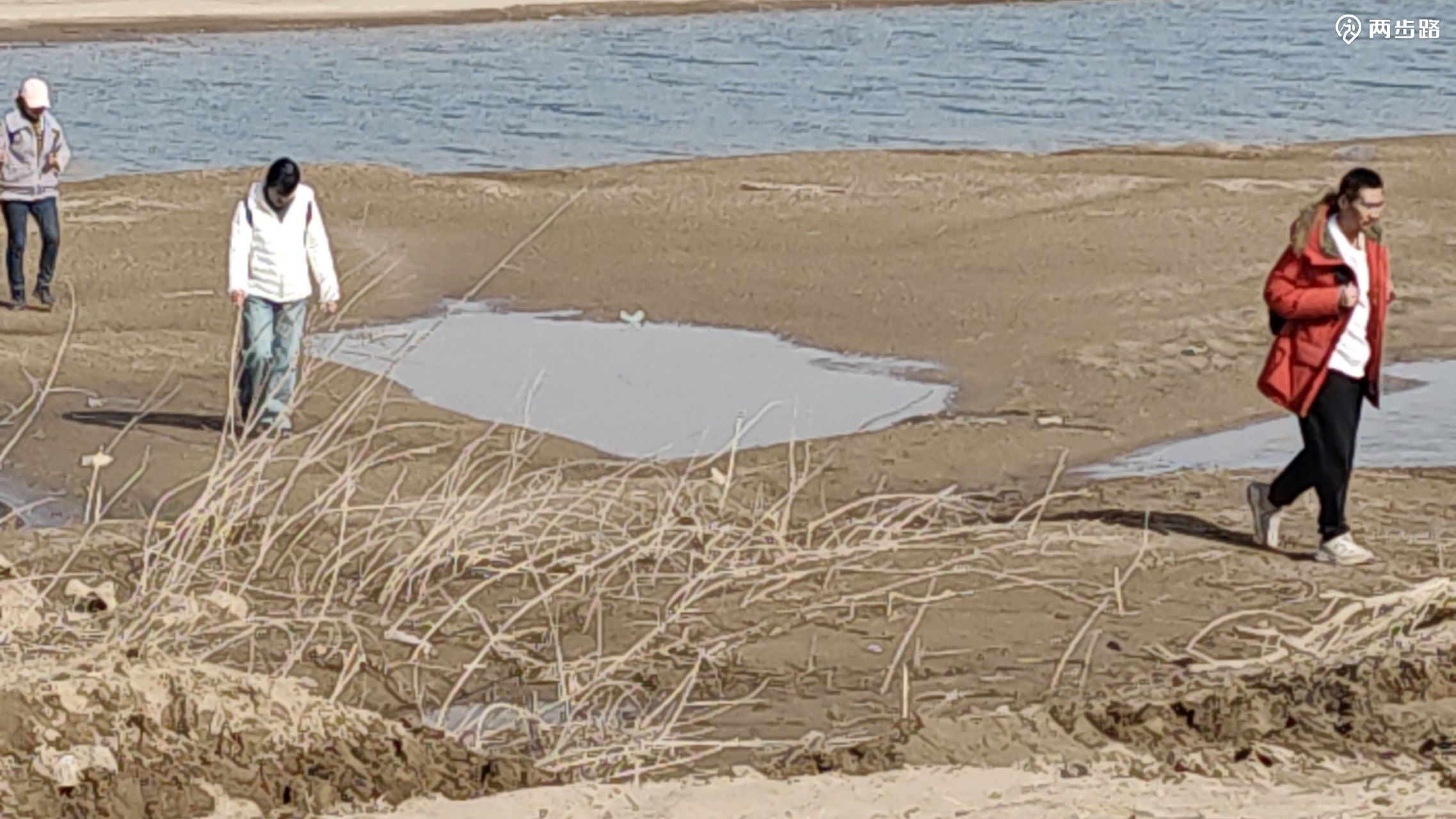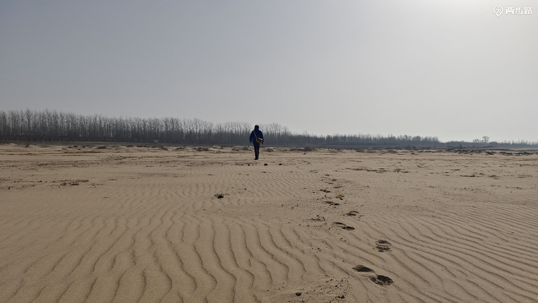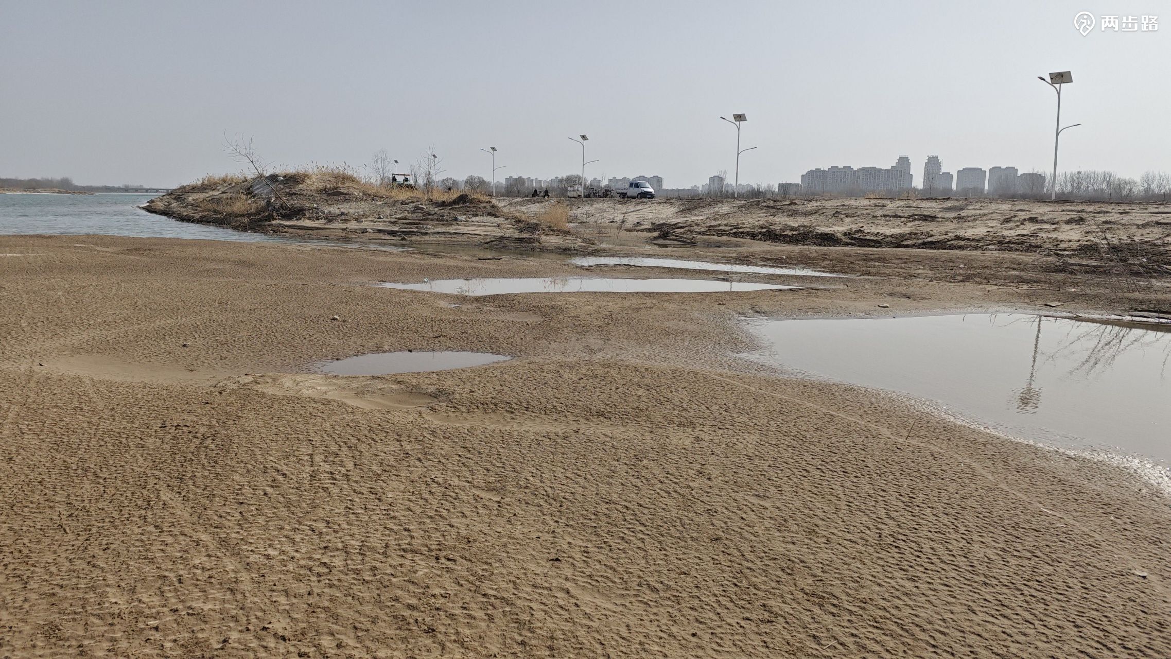由韩营向东,水泥路南侧的围挡还没撤除,路到尽头就是永定河右堤,我们没走右堤上的公路,直接下河滩,宽阔的河滩完全是一幅大沙漠的图景,水滩之间有一汪水,但没有连续的水流挡住我们前往对岸。