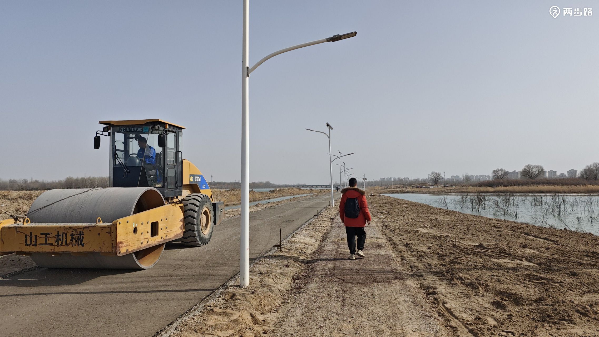 对岸正在修复被去年夏季的洪水冲毁的滨河步道,我向一个正在指挥施工的小头目询问沿这条正在施工的道路向南能否到固安县城,他说不知道,知道也不告诉我。李萍问,他就说一直沿这条路过去可以乘公交车。
