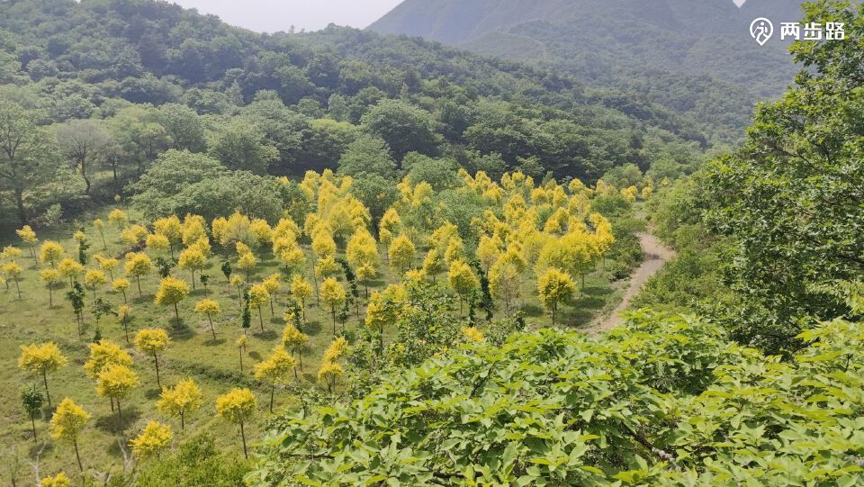 九里梁森林保护地里的金叶榆,太亮眼。画面里土路向上(地理上向下向西)指向九里梁(不)废村,向下(地理上向上向东)与河营路交叉后通往石槽村。
