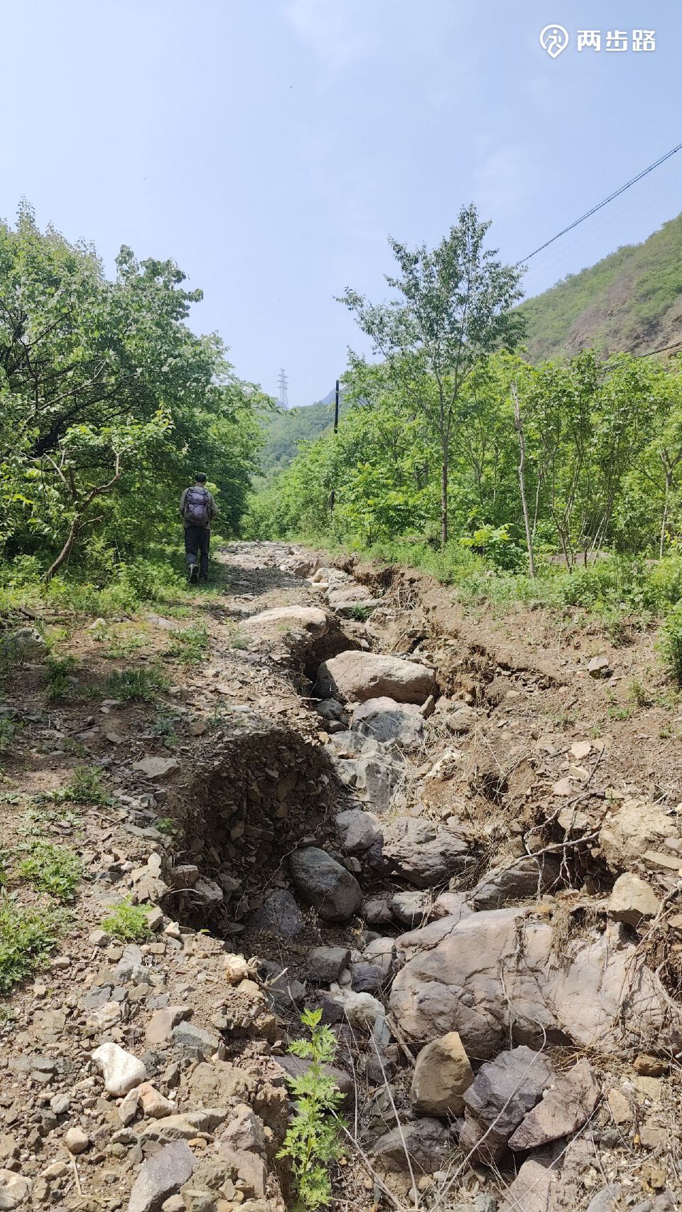 多处路面成了冲沟。不确定远方的高压线塔是否后来邻近的那个。
