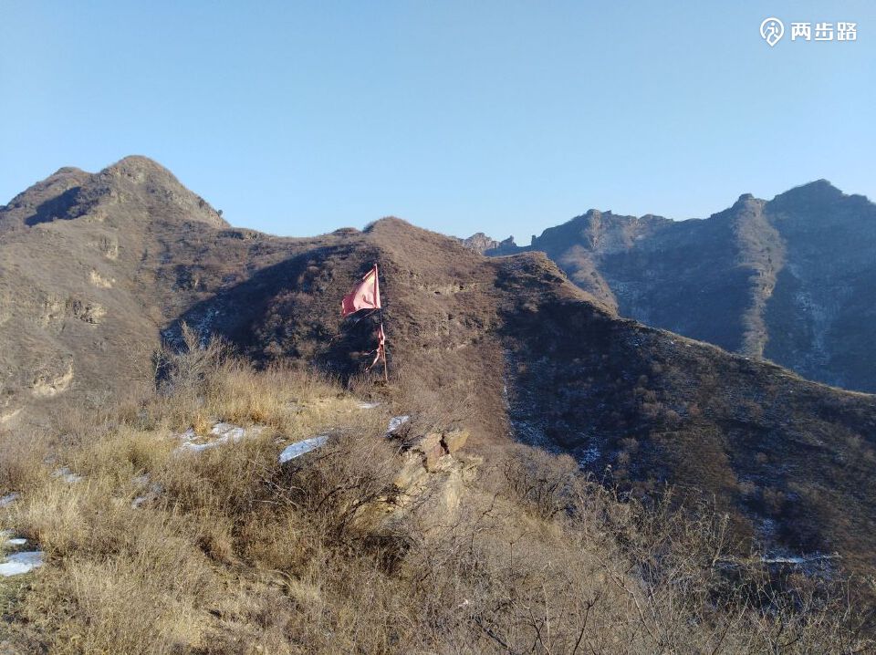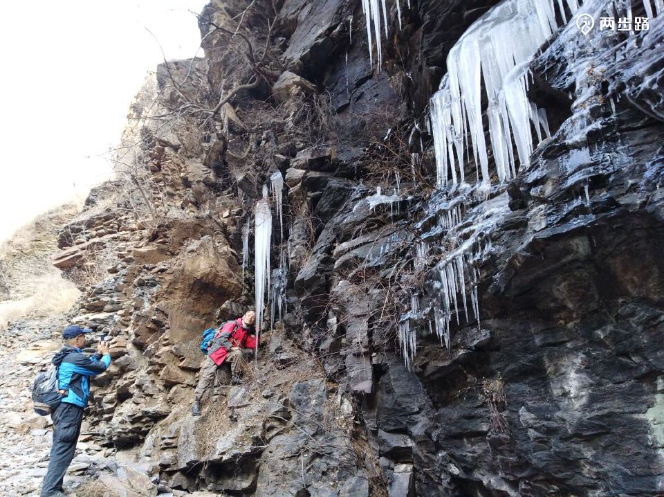 过东十八盘后,继续横切就上了南大坨到青径山的山脊线。山脊有路,山腰也有路,而我们的目标是栗园厂沟,翻过垭口后,开始了时急时缓的下降行程。经过一处豪华羊舍,看到挺立山梁的红旗,栗园厂沟上方的垭口就像对开的大门一样。沟的上方有冰凌,或者说是还在发育的冰瀑。沟中也有冰凌,还有柿子树、黑枣树,品相较佳。