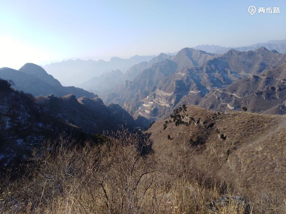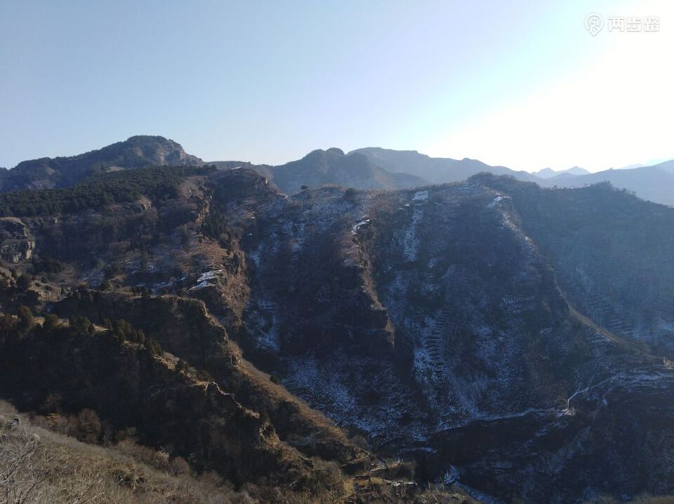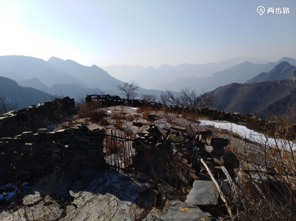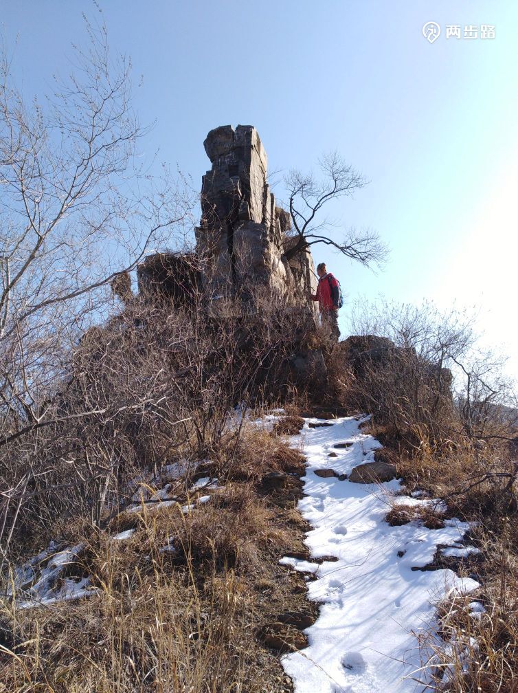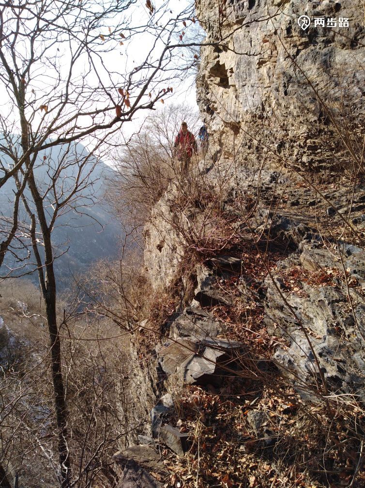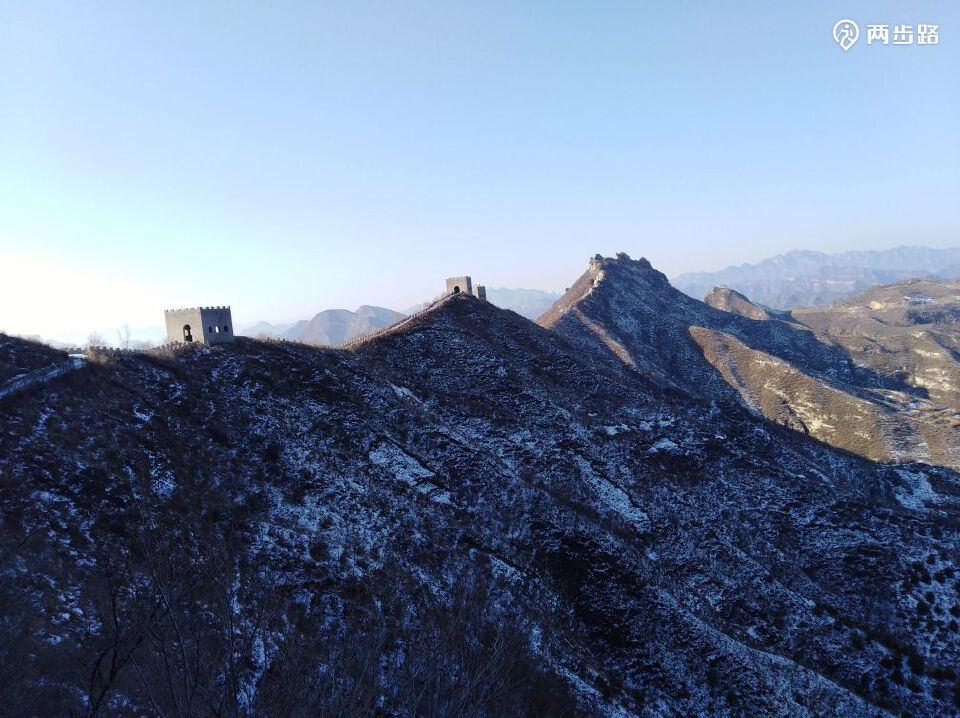 石板路铺上雪尤其滑。走近后看到左侧登顶白业角岭的旋梯,估计要多爬升100米。鉴于雪滑,我们没有去登顶,继续前行到长城头。然后离开长城,走上了漫长的横切路。