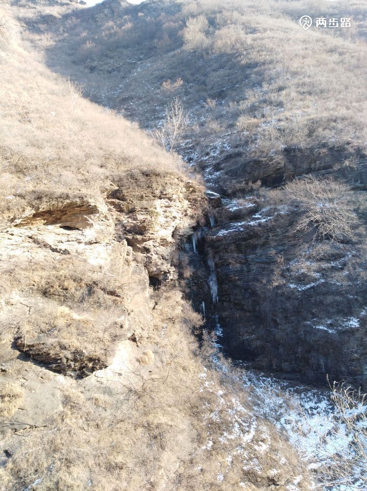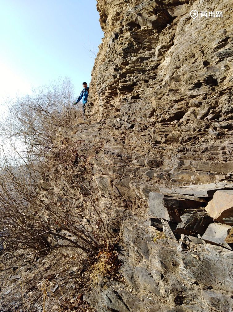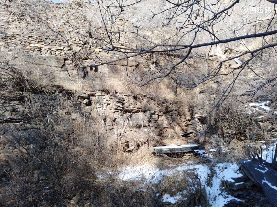 这里有以石块在崖边上建成的村寨,层层叠叠,坚固异常,像是堡垒一般。岩下有水渗出,下沟有路。从这条路进村彷佛经过长城的关口,壁垒森严。这条路虽然没有路网和轨迹, 但显然与下面的山腰横切路相连,而且据信,沿沟一直走,可以下到上双窑,出红井路。