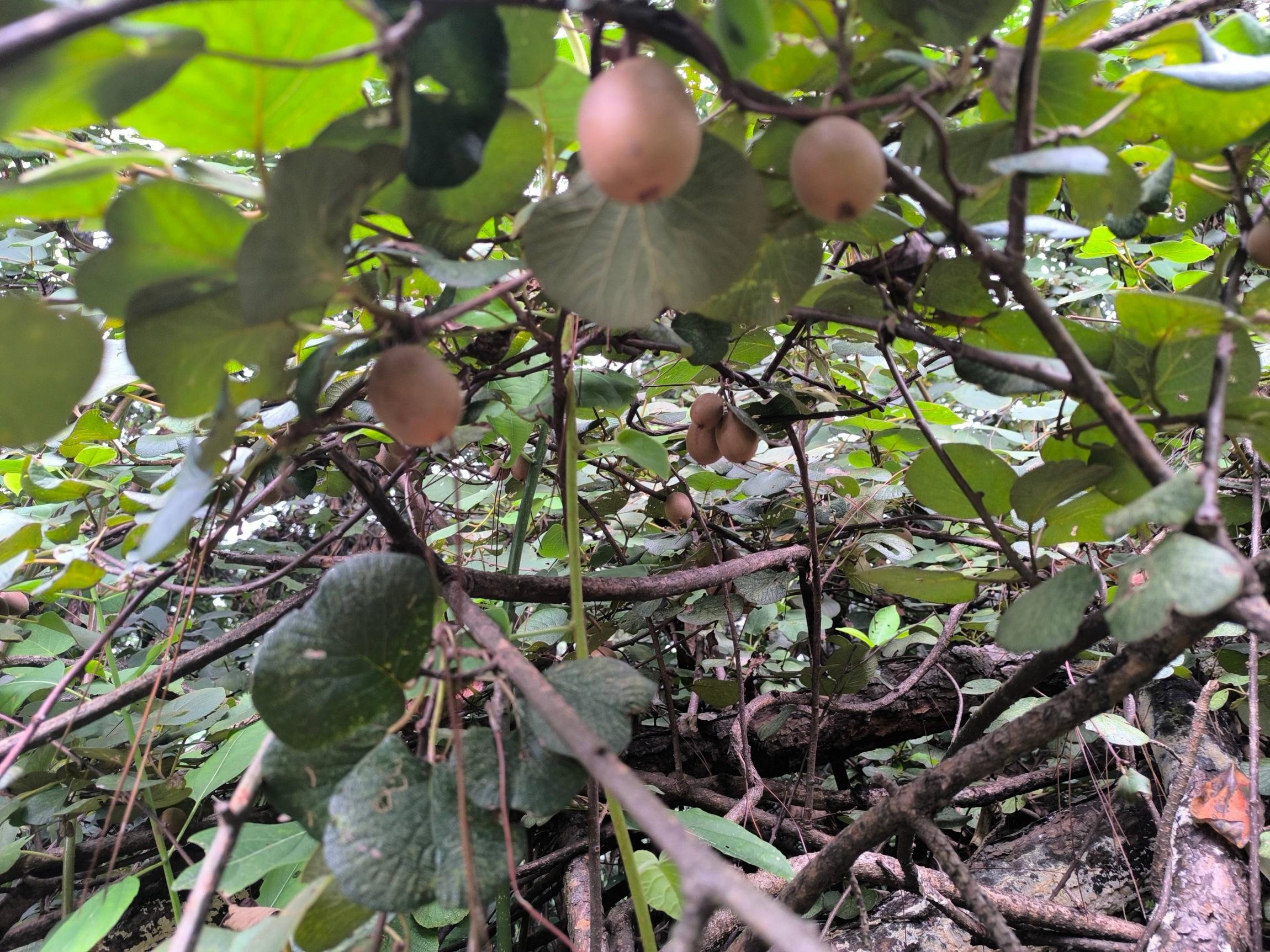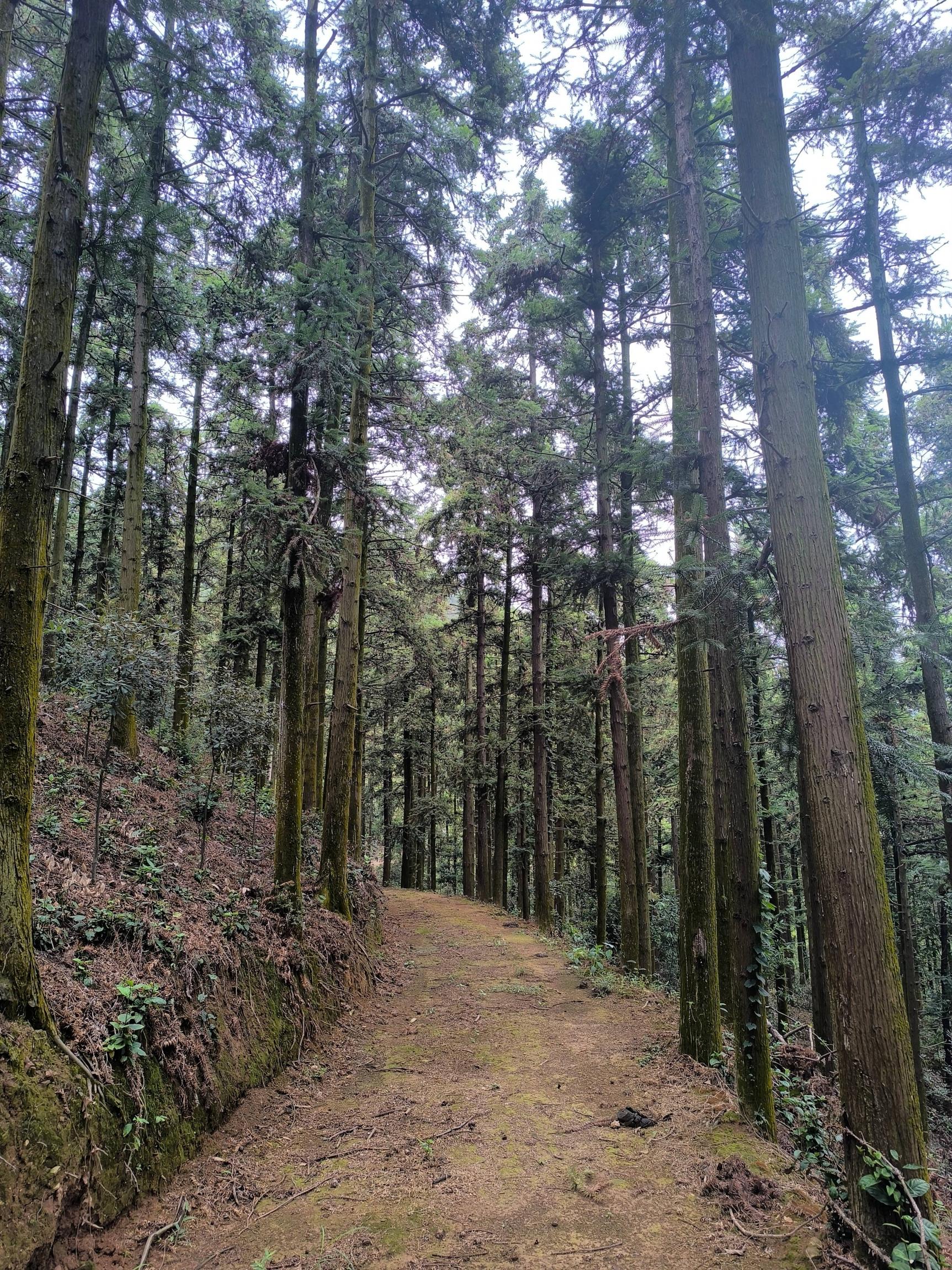 放下亭位于交通要道,西通凤凰村,东至资圣古寺。这次没有时间去资圣古寺、神鼎山庄探访了。向北可达神鼎山之巅——岳峰尖,这段路堪称今年走过的最佳徒步路线。道路经拓宽修整,两侧杉木夹道。凉风习习,树叶沙沙作响;踩着厚厚的落叶前行,连路边的灌木也被清理得干干净净,行走其间,仿佛置身于画卷。路边随处可见野生猕猴桃,我对采摘向来兴趣不大,留给后来人吧。