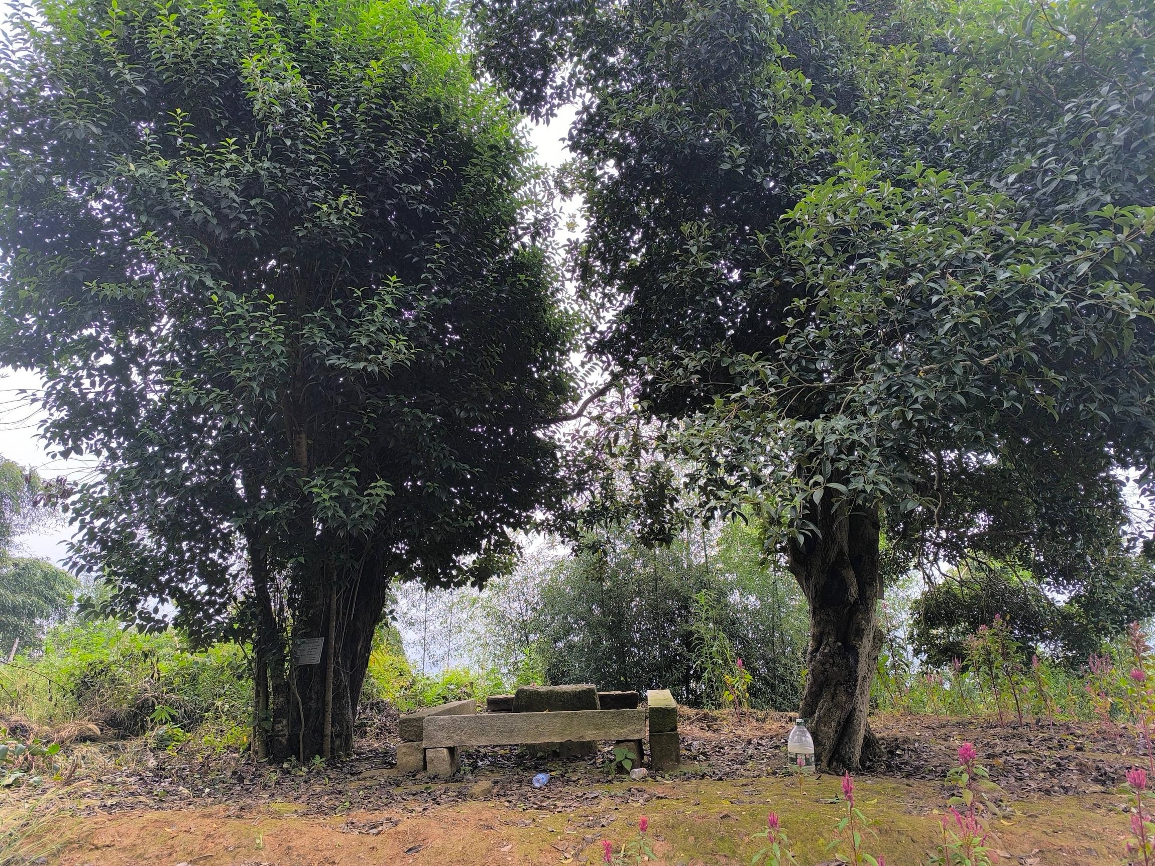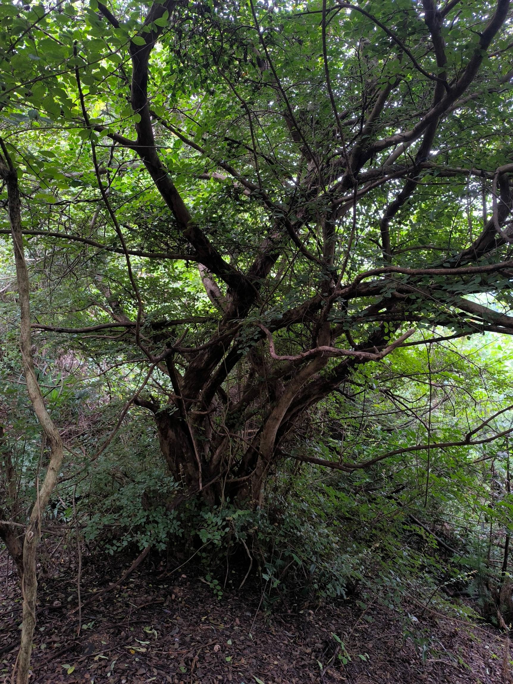 第二站是麻子山。进村问了一下老乡,说是有路,但不确定山背面还能不能走通。不探索一下还是不死心,麻子山新修了一些机耕道,但是脱离了设计的轨迹,只能沿着机耕道尽量往那个缓一点的垭口方向走,爬升快到山腰时,没有任何路迹了。折返到山脚处的一处人家问路,说是山背面是坟场,吓我一跳,后来查询才知道是“丰仓村”。老乡依然说是有路,但是不确定能否通行。还是想探索一下,这次的路迹清晰,路边还有村民接山泉水的管子,路上好几处地方塌方了,看得出来确实很久没人走了。这条路是可以上到山脊的,山顶上有一棵形态奇异的树,树下空空荡荡没有什么茅草,然而路在这里戛然而止了。往东肯定不行,越绕越远了,设计的是往北下到山谷里,再翻越到神鼎山,试着走了一段全是丛竹和茅草,下行难度会越来越大。那只能考虑沿山脊线往西绕行到神鼎山,方案或许是可行的,但是一个人,没柴刀,要穿越400m林子,那一刻我胆怯了。