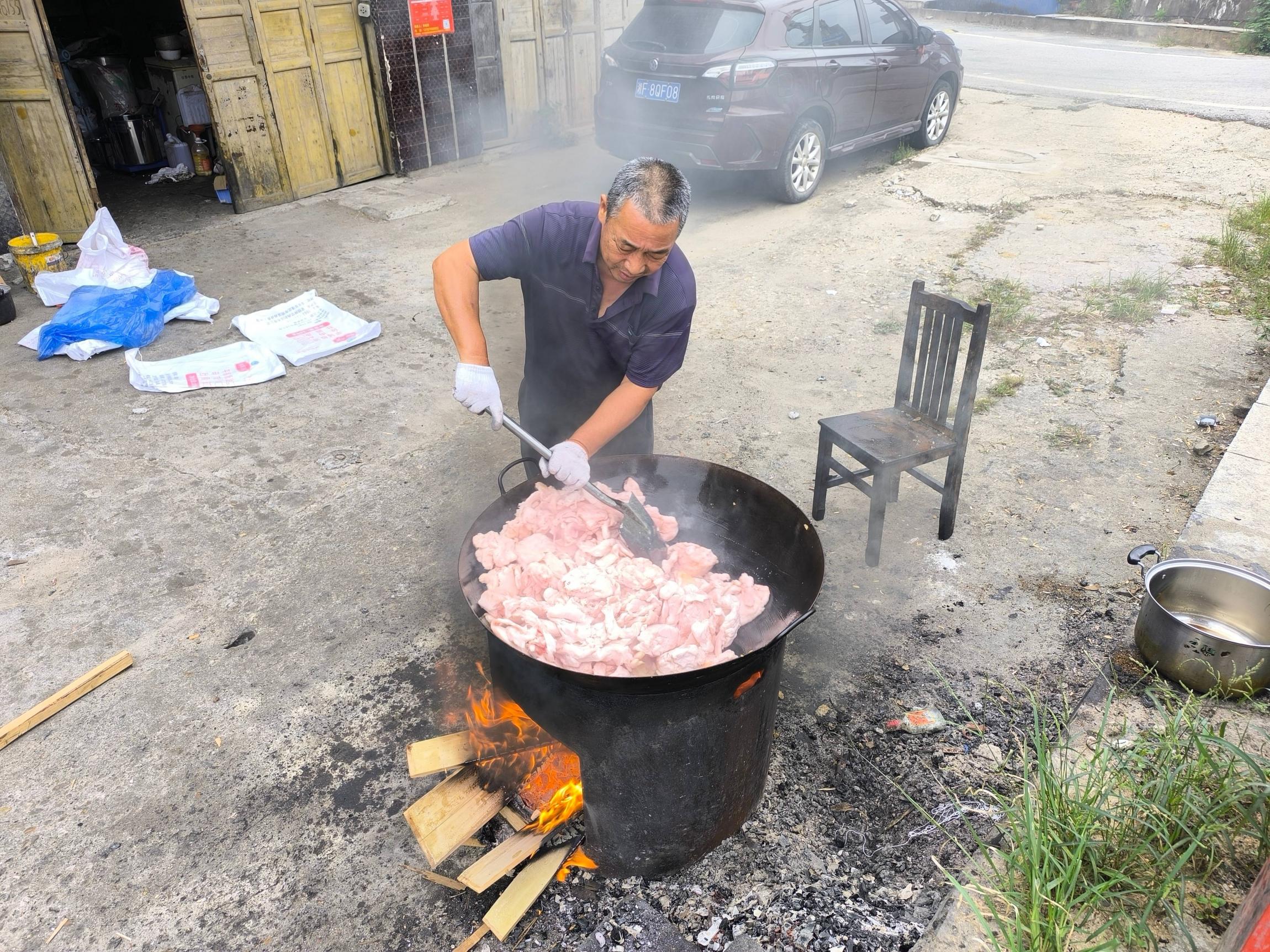 我是在黄柏镇中心下车的,左边是黄柏大酒店,右边是神鼎山镇卫生院,ktv和icu,一路之隔。下车就看到了一位大爷在熬猪油,铁锅铁铲柴火灶,人间烟火,最抚人心。
