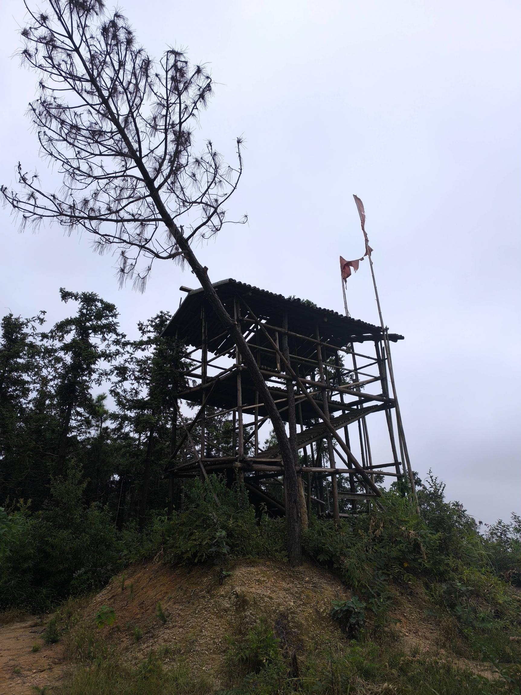 神鼎山的路况很好,宽敞的土路,长满了低矮的茅草,踩起来软绵绵的,路上随处可见烂掉的枞菌。山腰有两棵古树,一棵是120年的桂花树,一棵是130年的女贞树,枝干这么粗壮的桂花树我是第一次看到。树下还有几块麻石供行人休息。再往前走不远是瞭望台,旁边立有旗杆,旗子已经破破烂烂。瞭望台三层高,原木搭建,虽然不是神鼎山制高点,但是也可看到四野的景象。再前面看到一块牌子,上写“抗日战争纪念重地,树木禁止砍伐”。长沙会战时,薛岳利用神鼎山、汨罗江、飘峰山等构成天然防线,有效迟滞了日军南下长沙的步伐。