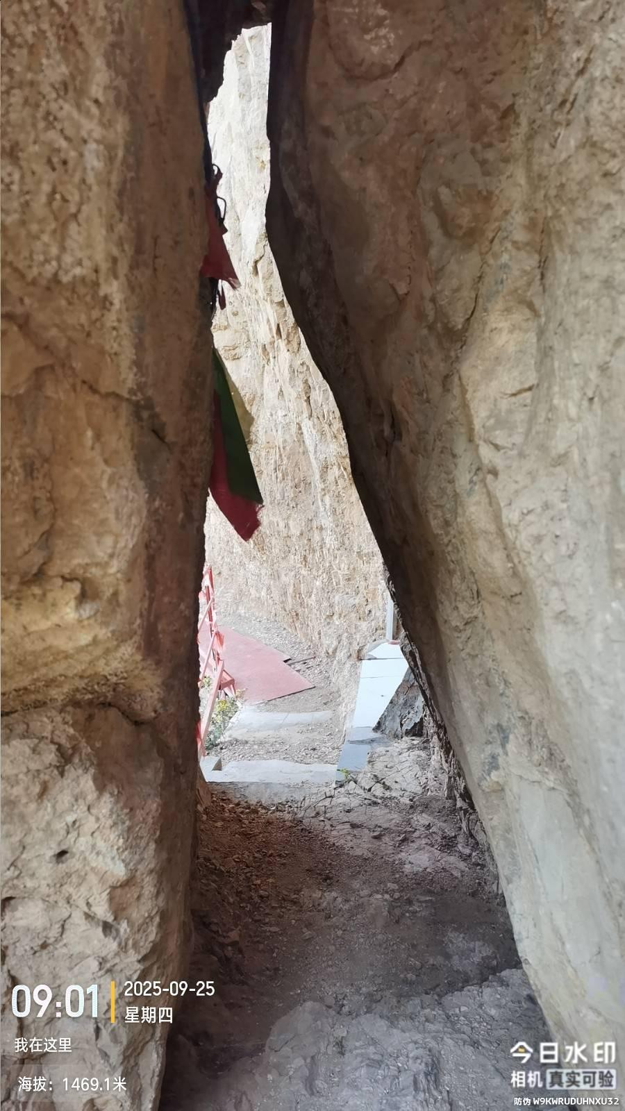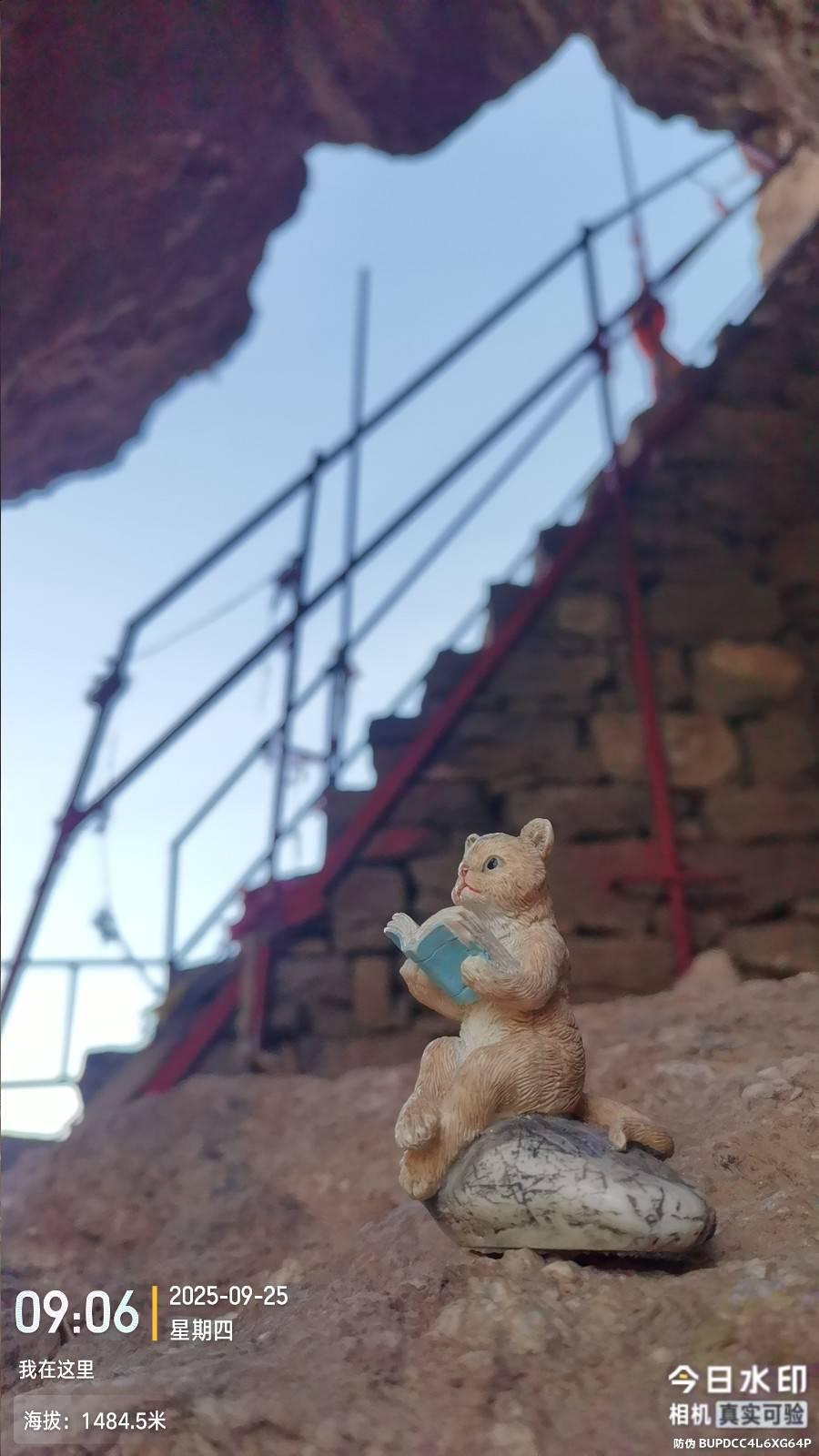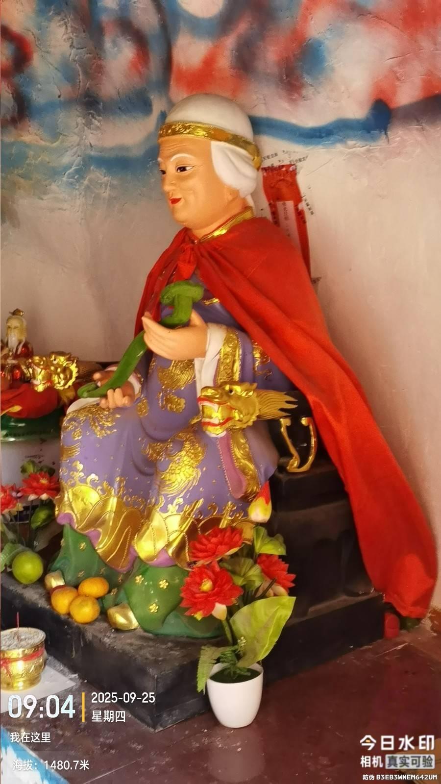 最高一处洞窟先爬台阶,后穿越一个三角形窄洞,再过一个天门洞,爬一个巨陡石阶入洞,且石阶是干石码放的没有任何固定粘和剂,好赖不长也就是7米高,洞有帘子,主坐老爷不认识 靠洞口有一对慈祥的老奶奶和老爷爷,面目和蔼可亲让人很舒心。下一阶层东北方向有三个洞窟,两块石碑,经过淋水发现一块是民国重修记载,一块是清朝重修记载。