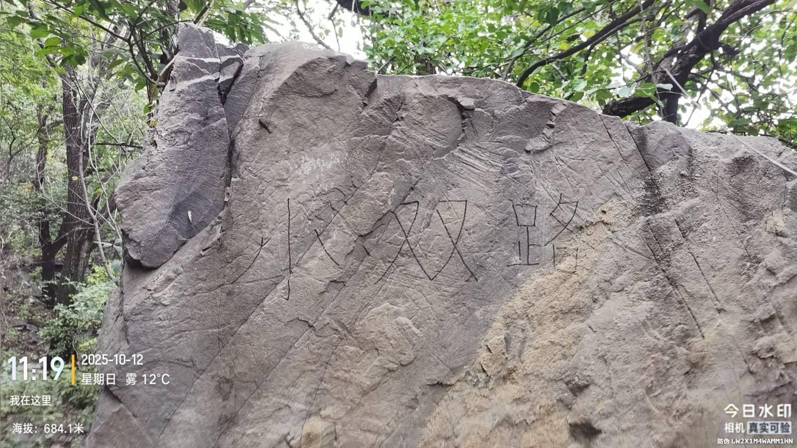 中午时分午餐选地方,一块梯田中有巨石,石南侧离地5尺堆石聚阶而上,北侧离地12尺居高临下。石上挺括西高东低,四个人盘腿应该可容。饭后鹰哥欣然题字“神仙石”。