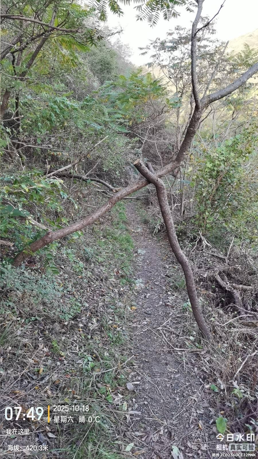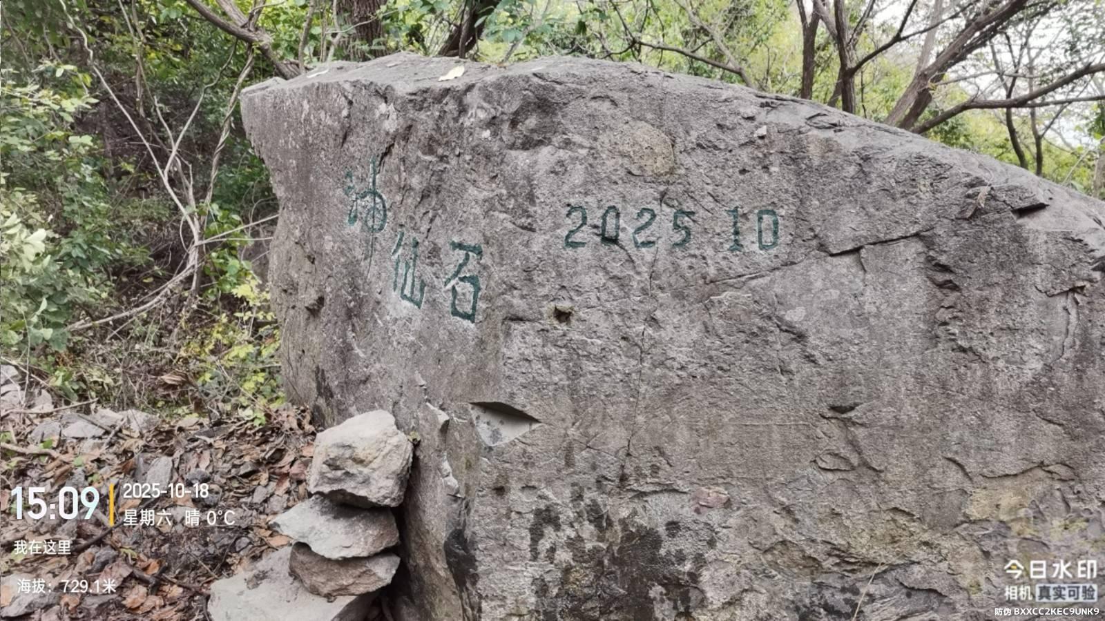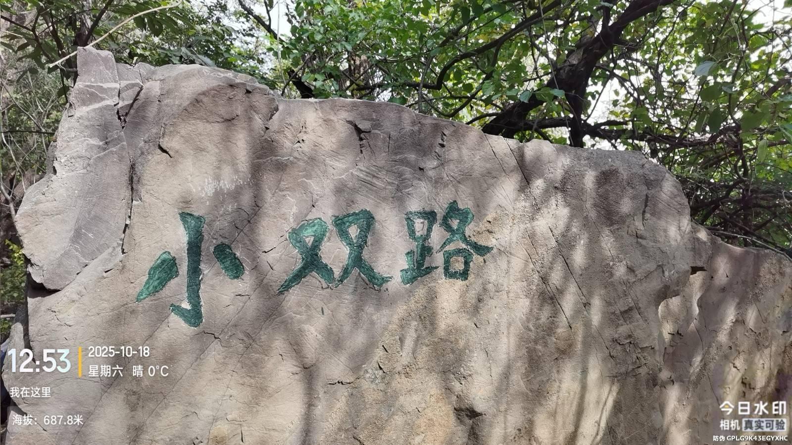 6:50和好友正黄旗19开爬,此时太阳初升不高,9:30到达小双路巨石,估计石头有80吨,是一块滚落石。从上香古道路走小双路540米到“小双路”刻石处,又走130米到“神仙石”处,又走330米到大圣路口,由此测算上山走小双路1000米和大圣路汇合,大圣路下行630米到磨镰石河茶棚和主路汇合。