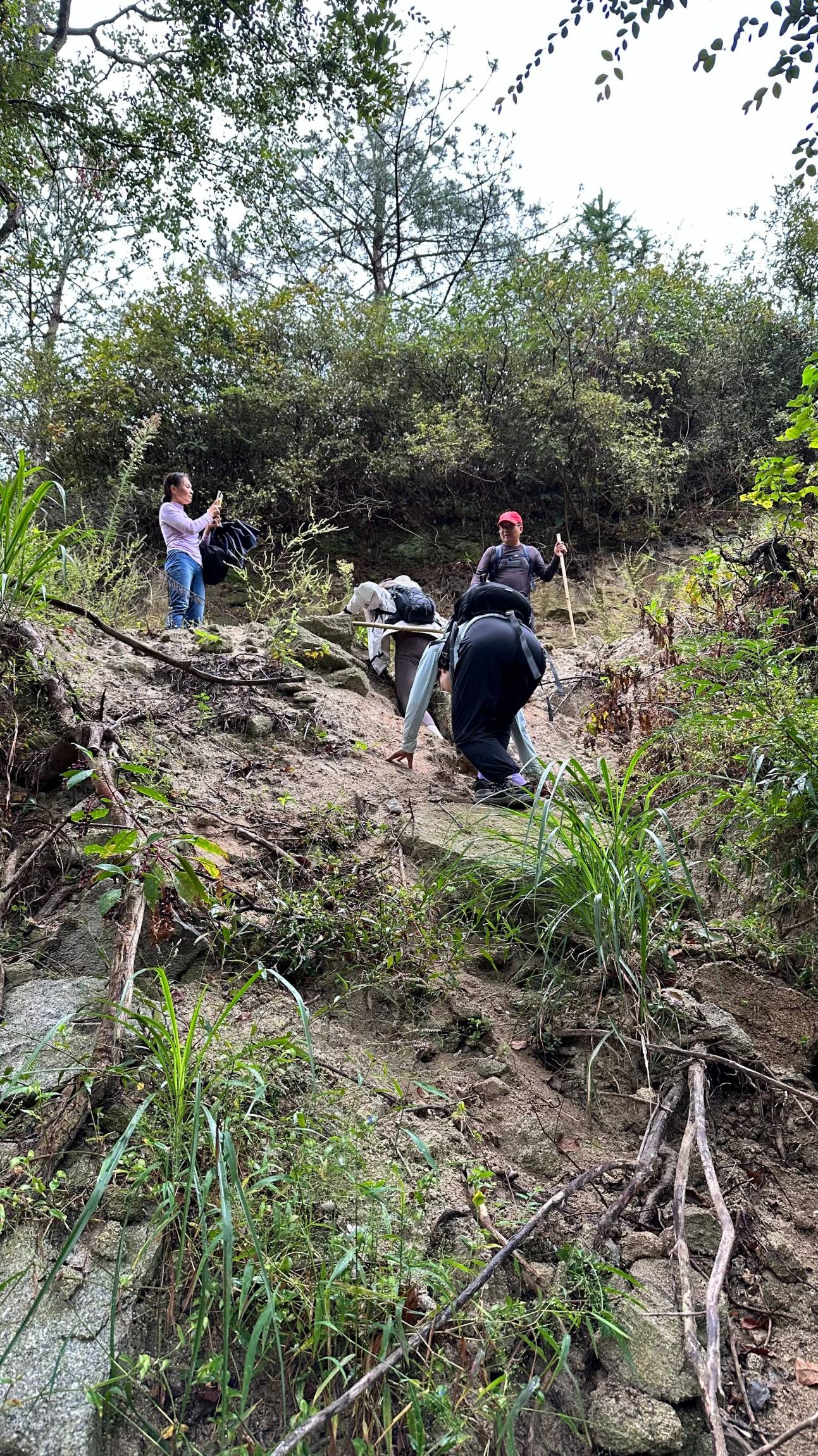 来时经过山峰水库,屋边人家门前洛神花美艳,墨绿南瓜横卧路边,处处风景如画。我是生怕惊扰,不敢大声说话,如午间路餐,歇脚躲雨屋檐下,不忍进屋粘湿老伯堂屋地面,宁愿站着和大家一起分享简单食物,也不愿打扰。但很开心,甜甜的饼让我醉了,熟板栗来不及吃,好像放在了窗台上,忘记带走。但是随身带走了垃圾,没有放在撮箕里,想着山高路远,老人家不太方便,他们养了鸡鸭,种了菜,应该可以堆肥,不过塑料之类的垃圾,我还是放在包侧边带走。也带着美好的心情,开始低头弯腰,钻拔茅洞,扶石爬坡,上到大马路。
