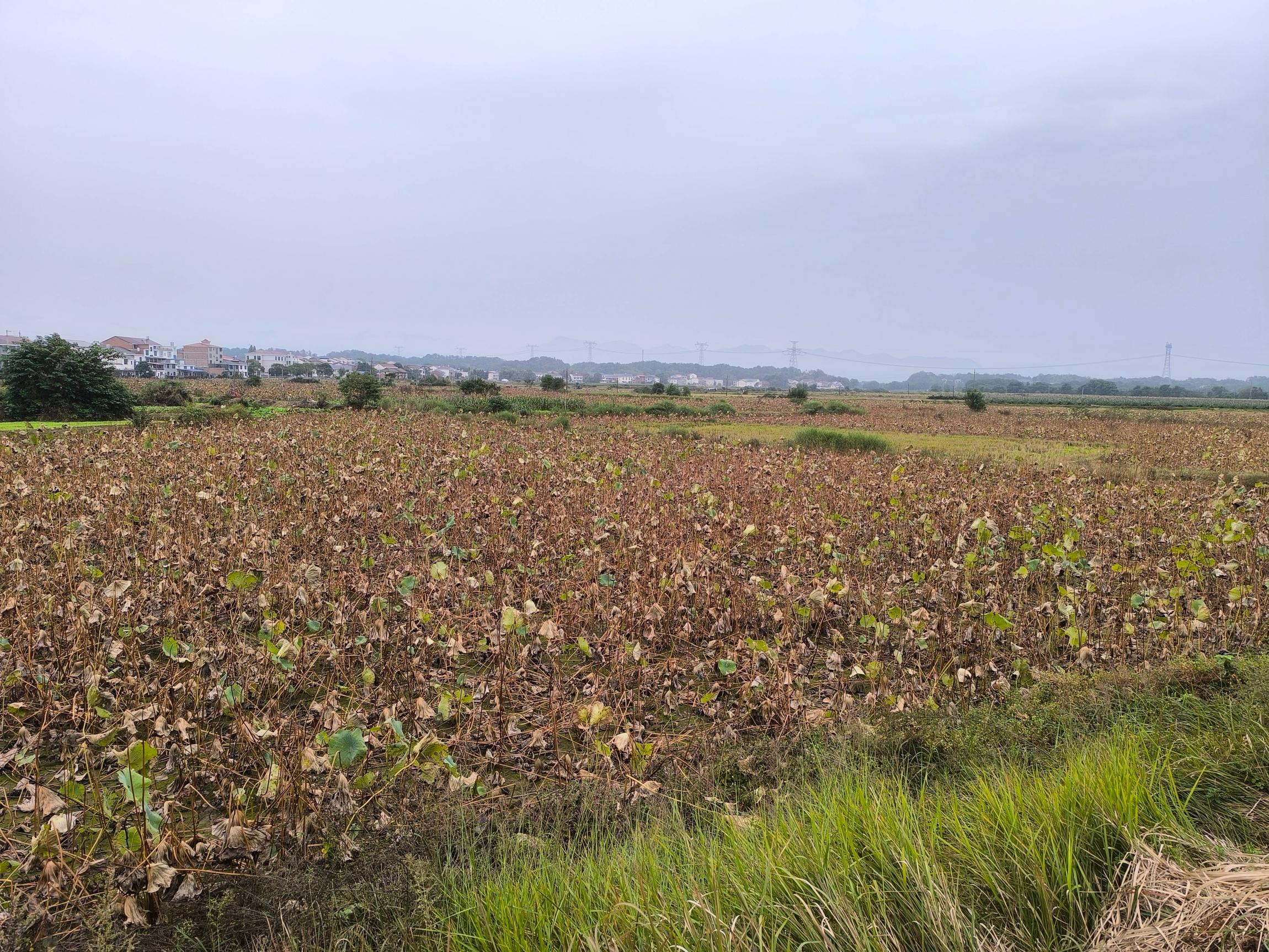 返回到焦桥集镇,在坪上村路口和彻道者、琳梓汇合,前往培文塔。大路两边沃野千里,视野极为辽阔,远处的石柱峰隐约可见。除了已收割完的稻田,还有大片的荷塘,告别了夏日“接天莲叶无穷碧”的繁华,迎来了“留得枯荷听雨声”的孤寂。细长的荷茎或斜斜地倚向田埂,或倒伏在泥水中,还有少数倔强地挺立着;荷叶大都是深浅不一的黄褐色,边缘卷缩形成层层褶皱;到此方知吴冠中笔下的残荷不是写意,胜似写实。紧邻的茄子地却另是一番景象,深绿色厚实的茄子叶,淡紫色泛着光泽的茄子,仿佛在说:秋末未远,生机仍在。然而马上都要立冬了,“霜打的茄子——蔫了”这句歇后语是不是以后不能用了......