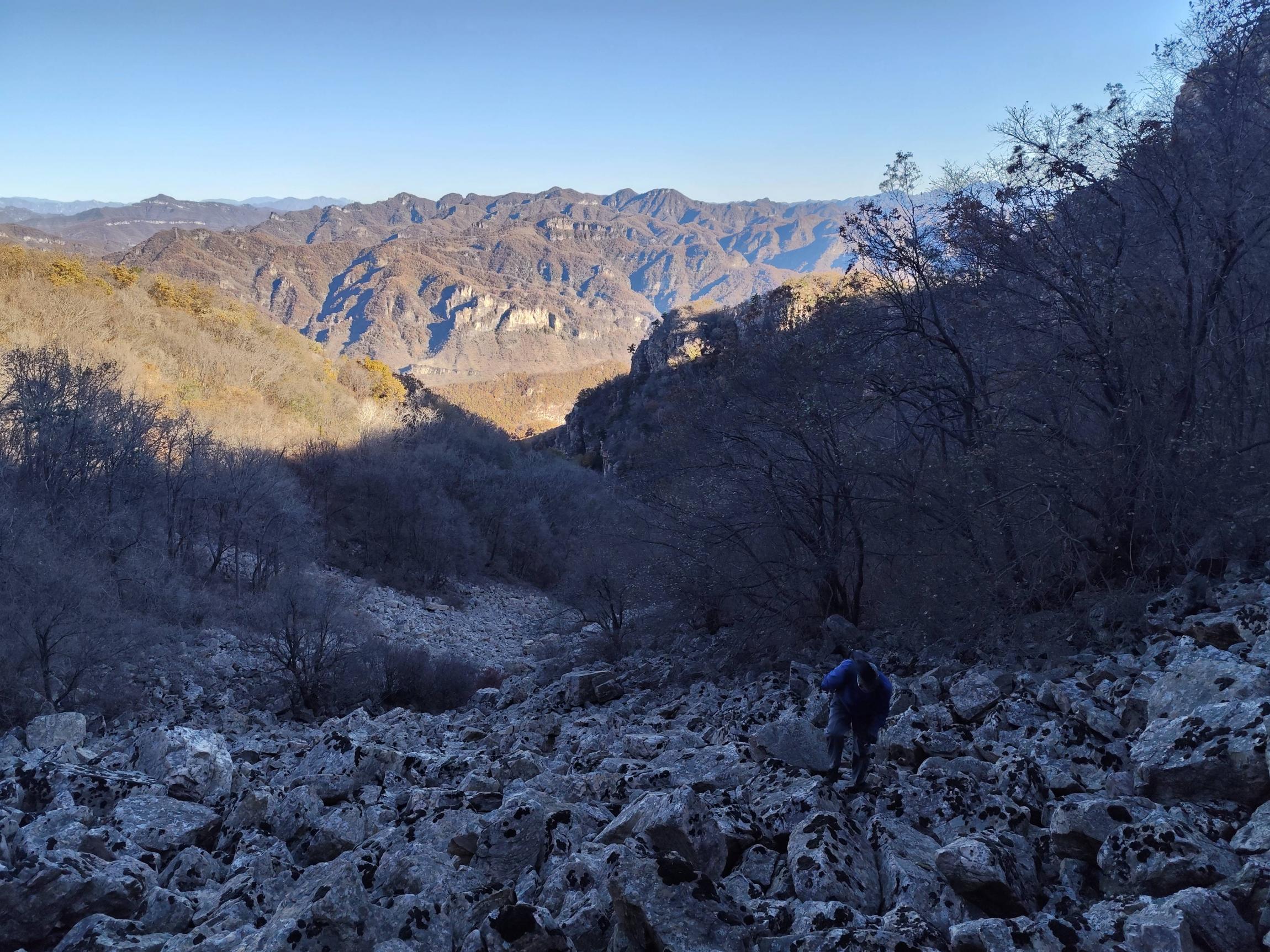 借西台子村南机耕路进山,爬上一片栗子树地,穿过一处狭窄沟谷,之后岔口左转,进入东侧一无名山沟。至海拔约645米处,梯田走到最上端,随后溯沟谷向南爬升,小路痕迹不明显,起初一段路为流石滩、灌木丛的混合路段,边钻林子边跳石头走,微虐,到海拔约835米处,出现大片石海,沿石海攀爬上去,没有平谷石海那样夸张,走起来有点感觉。