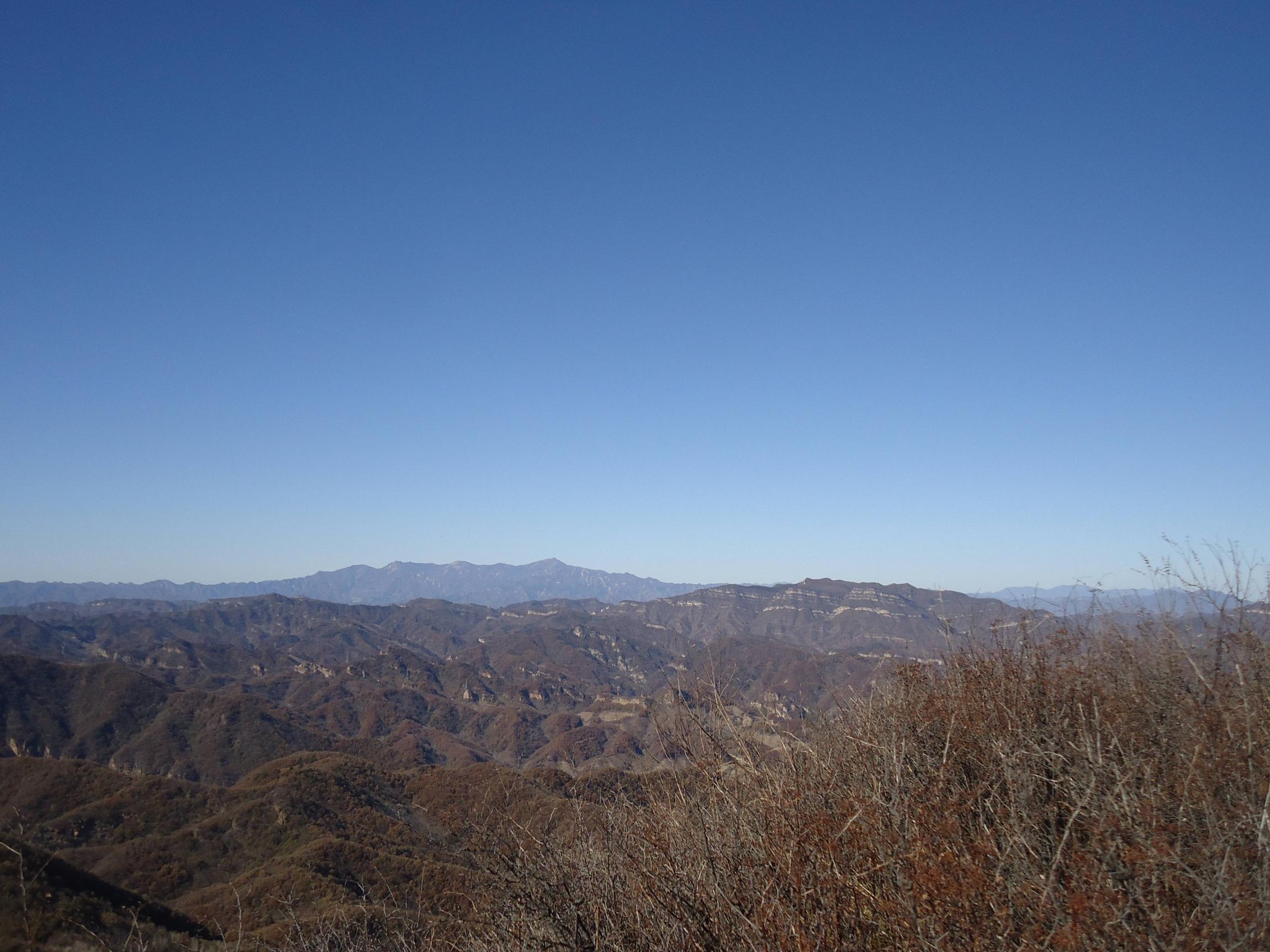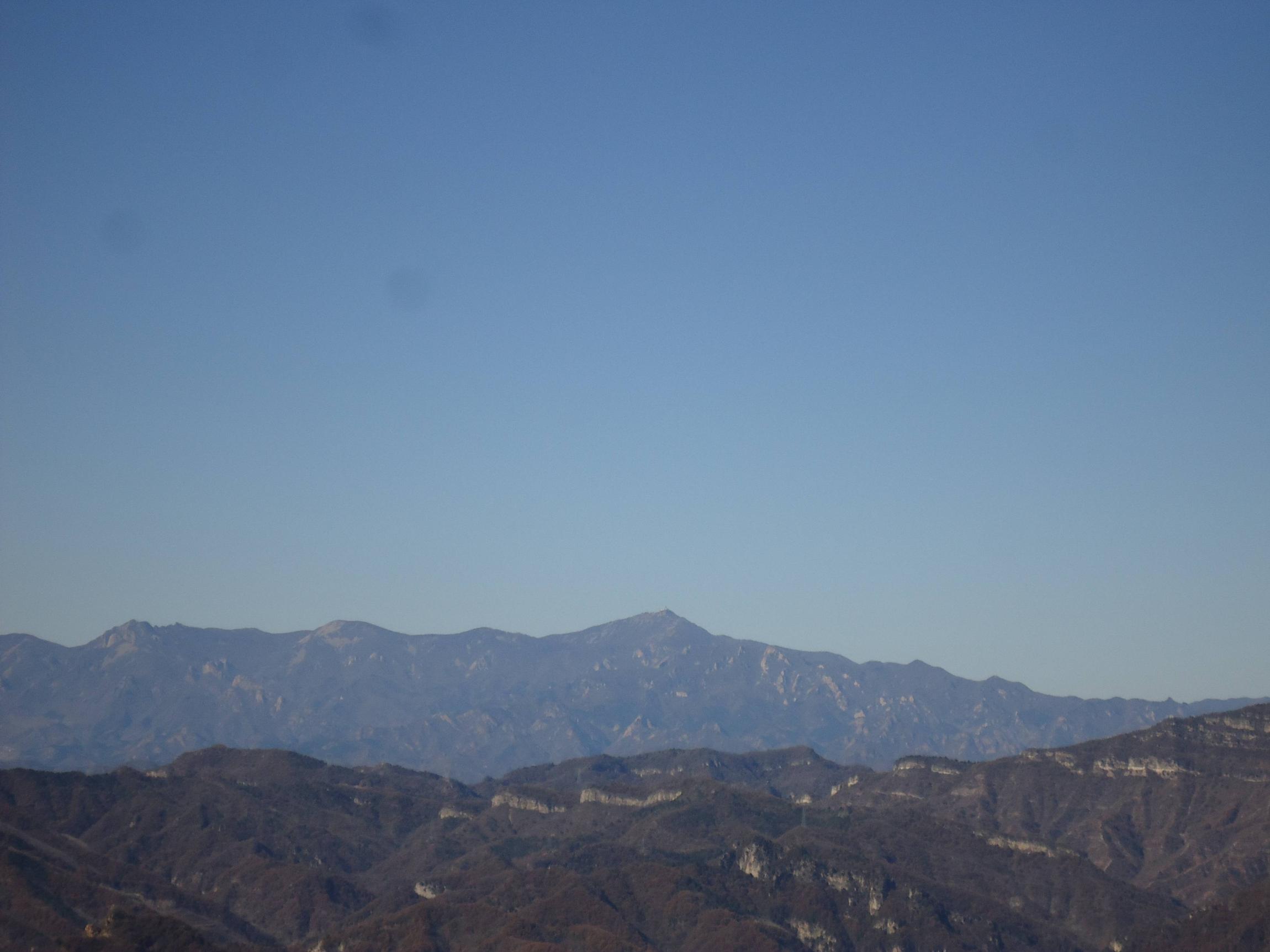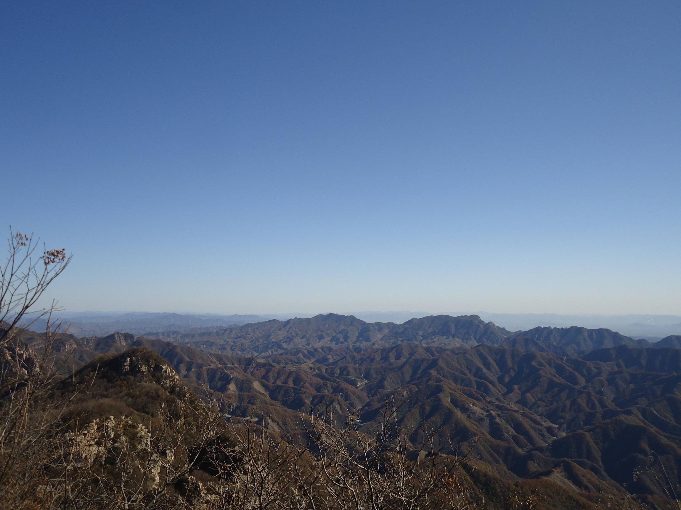 回到观景平台下面,往西南进沟去雁飞岭,雁飞岭的路比东大洞的成熟多了,一路上有断断续续的布条路标,没什么难度。唯一比较野的地方是登顶一段拉抽屉,稍微有点钻林子、攀爬,12:39登顶雁飞岭山顶,该山位于南天门西南、大河峪东北、花木岭西北,海拔1141.7米,顶有固定铁三脚架水泥块残留。雁飞岭是东西向单面山里向南挑出崖壁的一座孤峰,其东西两侧各有略矮山峰次第挑出,形似大雁行列南飞,或为山名之缘起,雁飞岭主峰东、南、西三面临崖,南侧断崖高差在百米以上,视野相当开阔,北可瞻雾灵天峰磅礴玉宇,南可瞰东陵烟霭紫烟驻留。