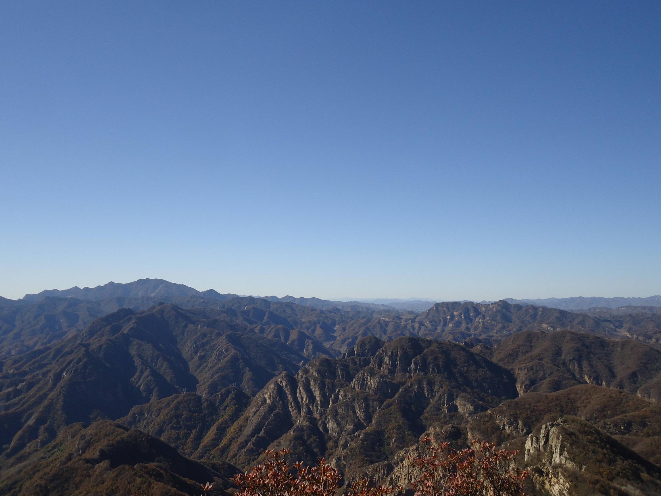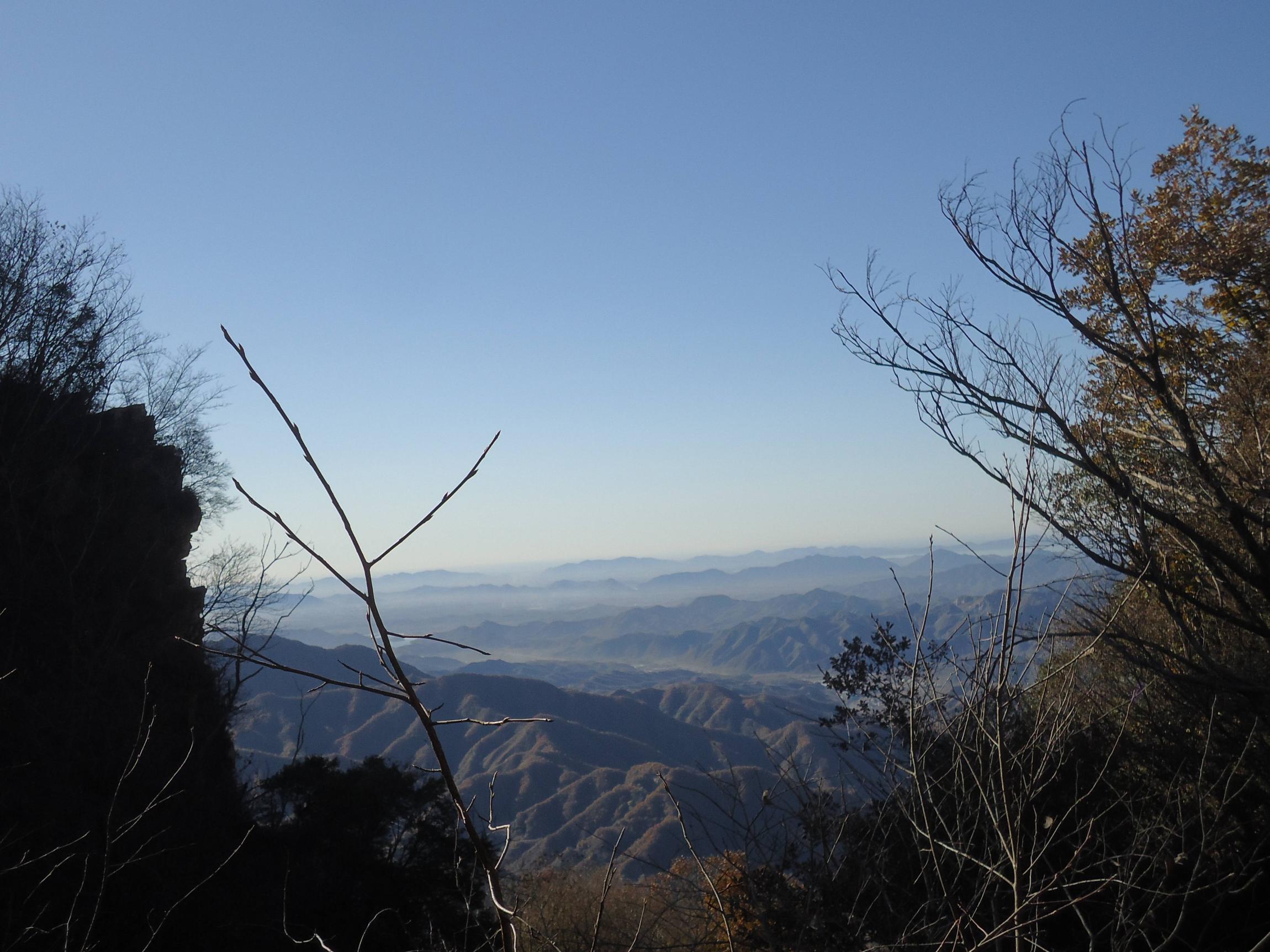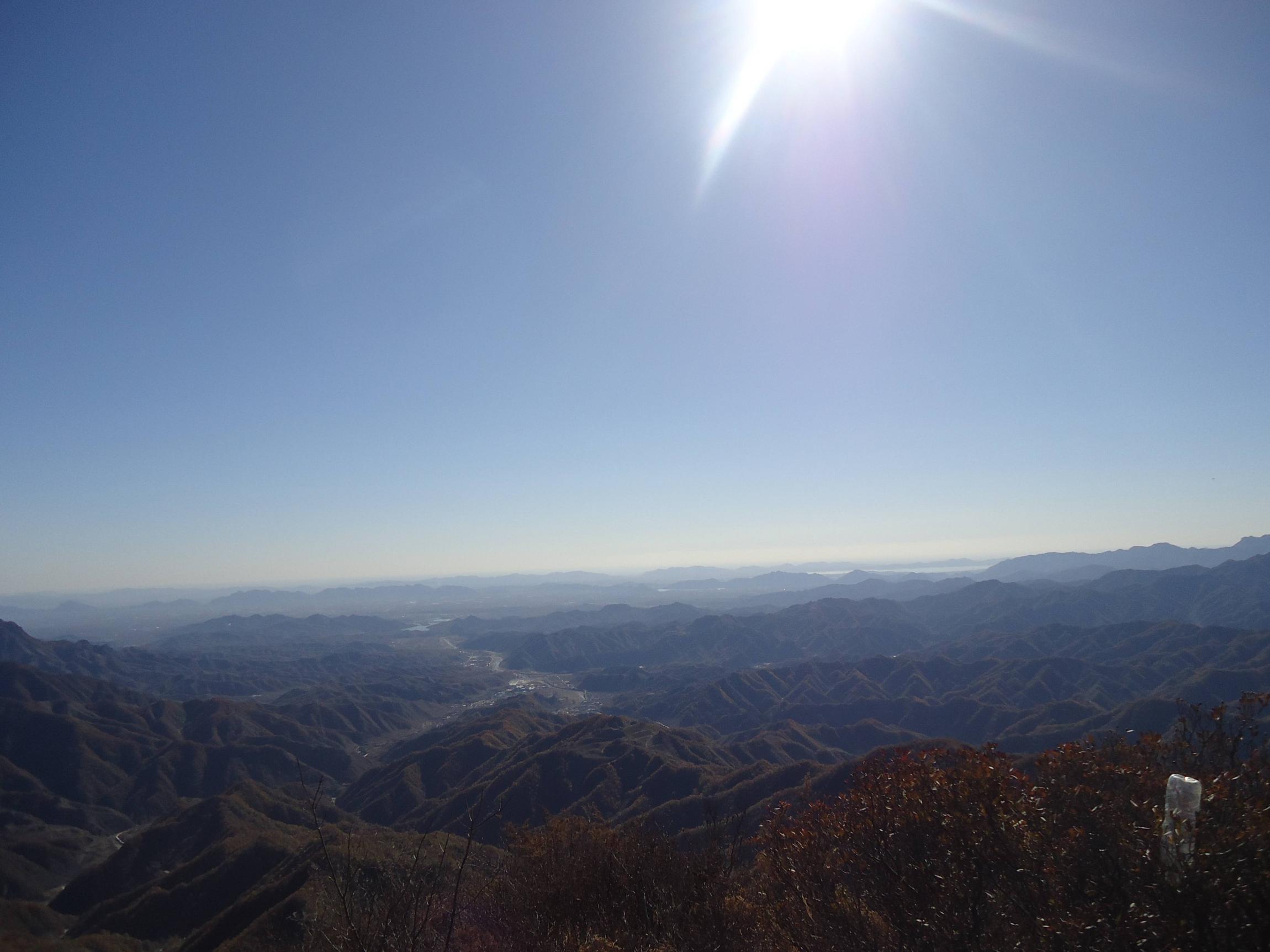 回到观景平台下面,往西南进沟去雁飞岭,雁飞岭的路比东大洞的成熟多了,一路上有断断续续的布条路标,没什么难度。唯一比较野的地方是登顶一段拉抽屉,稍微有点钻林子、攀爬,12:39登顶雁飞岭山顶,该山位于南天门西南、大河峪东北、花木岭西北,海拔1141.7米,顶有固定铁三脚架水泥块残留。雁飞岭是东西向单面山里向南挑出崖壁的一座孤峰,其东西两侧各有略矮山峰次第挑出,形似大雁行列南飞,或为山名之缘起,雁飞岭主峰东、南、西三面临崖,南侧断崖高差在百米以上,视野相当开阔,北可瞻雾灵天峰磅礴玉宇,南可瞰东陵烟霭紫烟驻留。