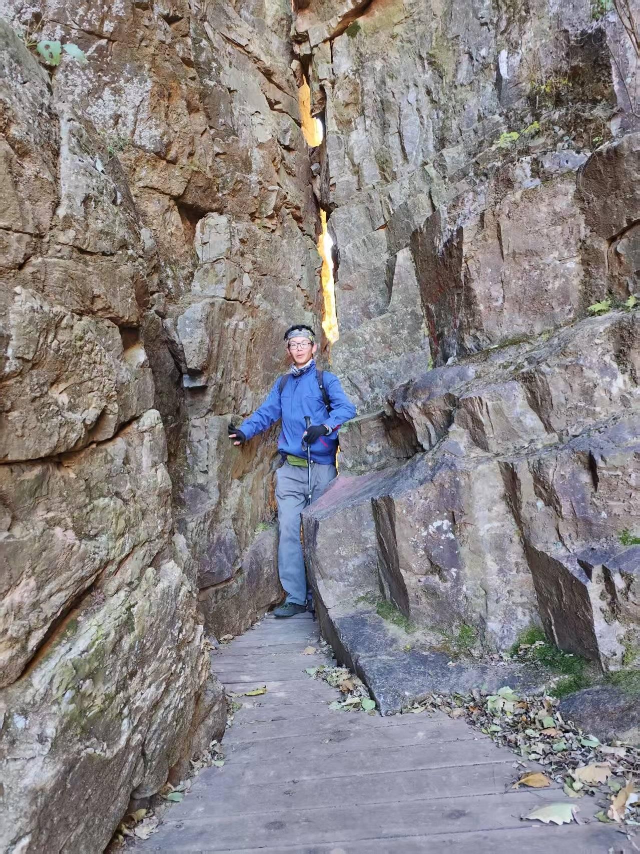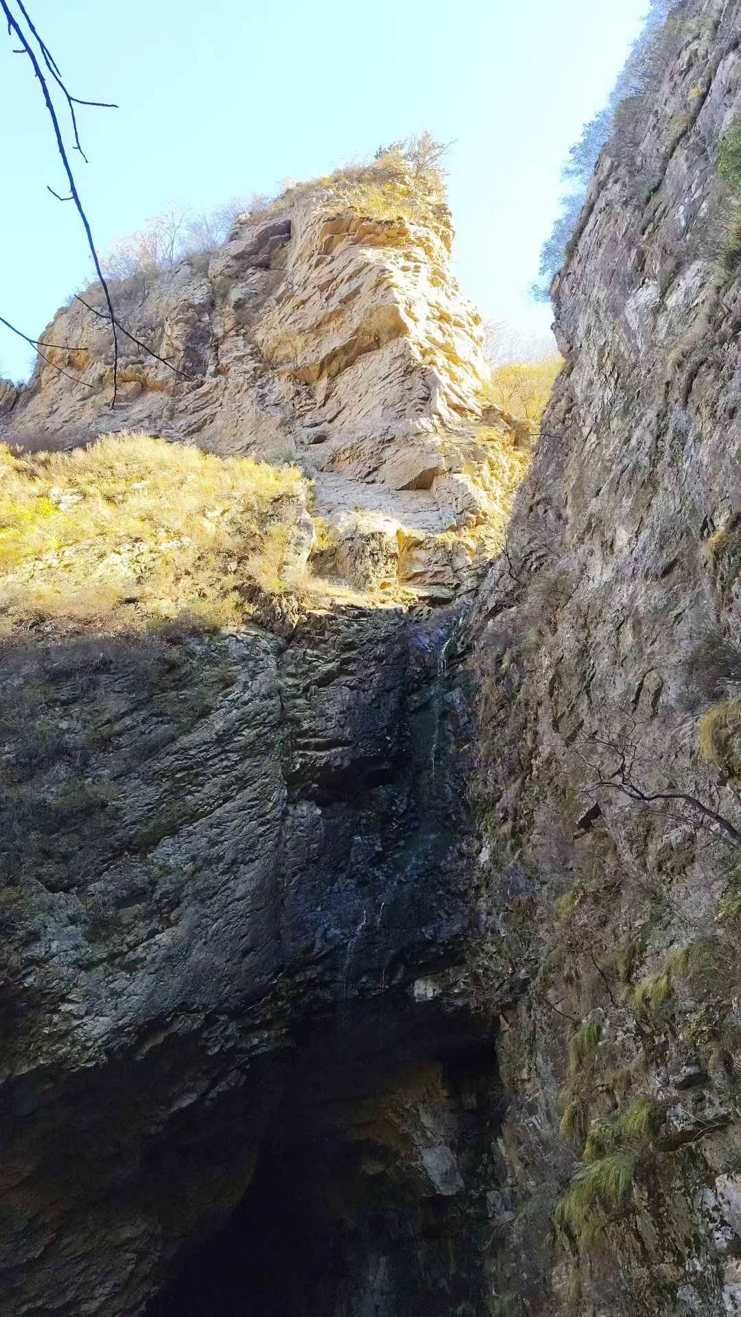 跳儿沟往下,回到梯田,随后左转,经由图标“西沟”往绿溪谷方向翻山,沿途除了翻越山脊垭口一段都是栗子树地。11:02进入绿溪谷景区,这个景区和隔壁的南天丽景景区是一个开发商开发的,联票80元,淡季似乎已经歇业,里面的商店无人运营,有个骑摩托车进来的,看起来是游客打扮。绿溪谷景区有大瀑布、一线天、观景平台三个主要景点,大瀑布落差目测在30米以上,下面有个水帘洞,栈道能过去,深秋夜晚气温低于0度,栈道上的水已经结冰,冬天有冰瀑的时候会更漂亮。水帘洞右侧一个裂缝陡升上去,过旋转楼梯,见一线天,最窄处不足30cm,过一线天,豁然开朗,回归金红世界,走到步道尽头,景区在最高点建了一个观景平台,海拔约820米,一个玉麒麟的雕像能骑上去,很适合打卡、拍照。