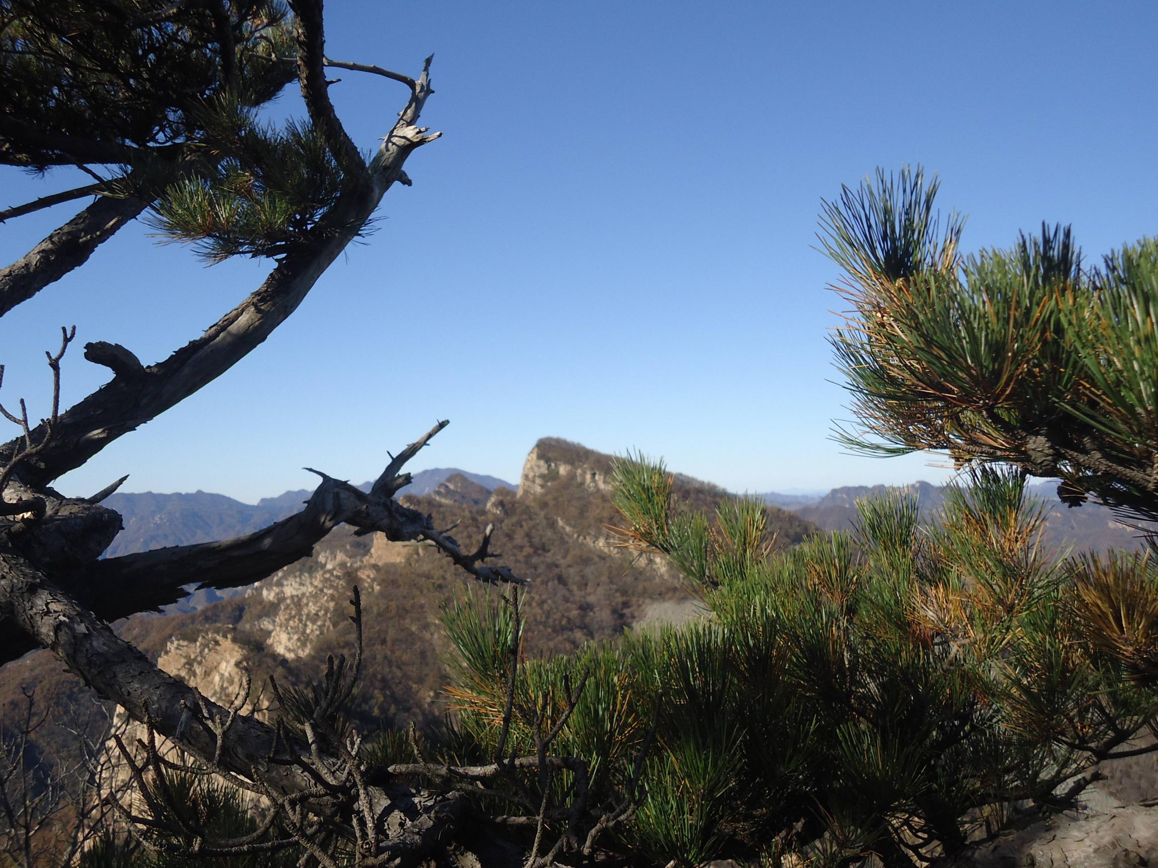 9:26登顶千米山峰东大洞,该山位于小龙门沟东北、跳儿沟东南、洞儿沟西南,海拔1100米,呈南、北双峰结构,南峰为高德地图图标位置,实测海拔约1087米,有前人留下的一个易拉罐,北峰实测海拔约1086米,有一棵标志性的松树,颇为遒劲,两峰植被较密,东、西两侧临崖,崖顶能找到一些石头,视野较为开阔。