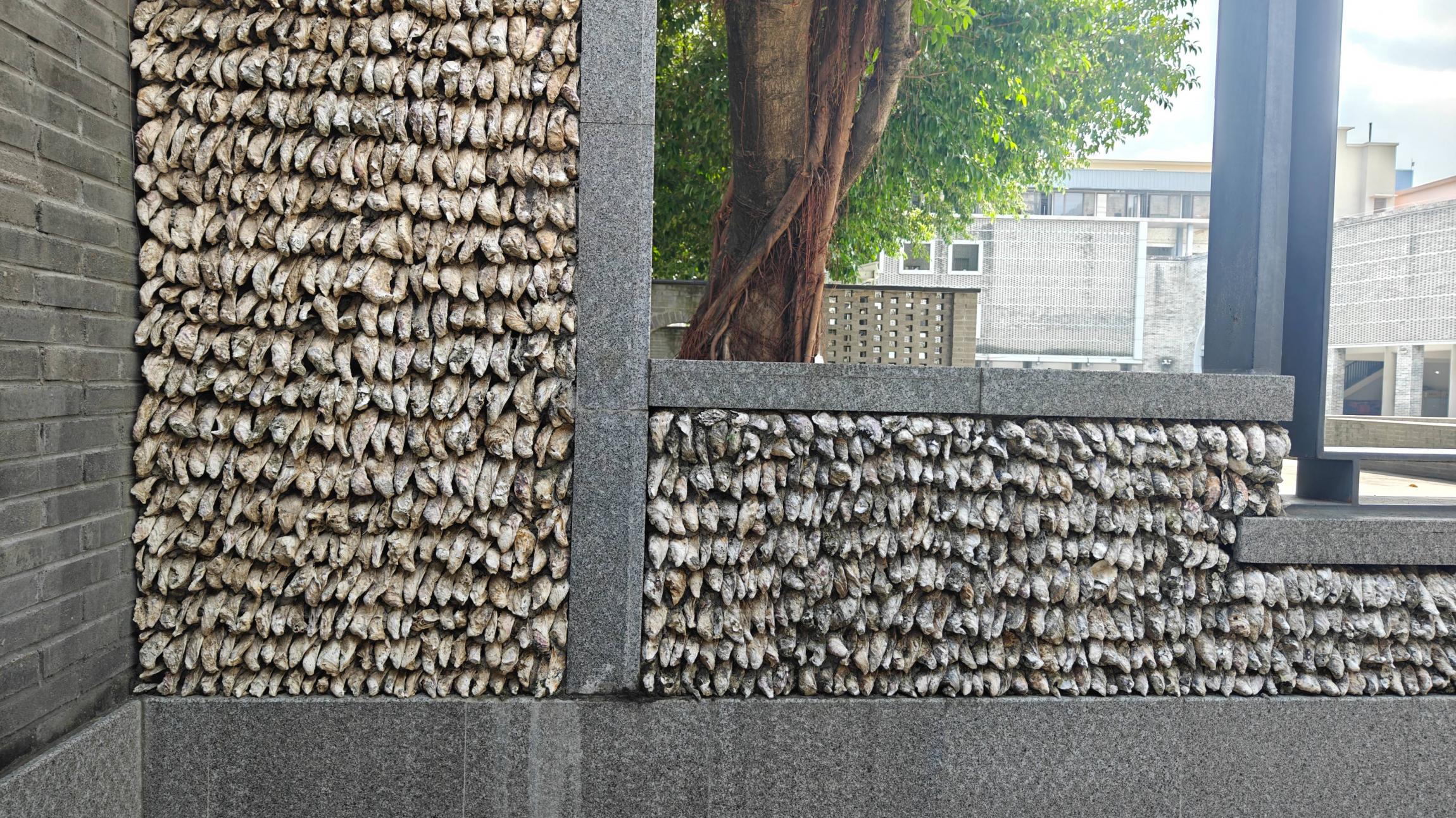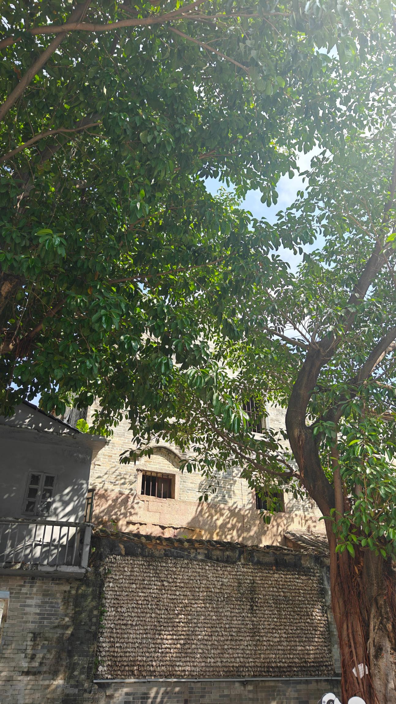 外面的街道很热,让人整体上感官很燥。但是这里有老榕树,气根很多,温度一下子降下来了,人在这里觉得非常舒服,照片里面是蚝壳屋,整体都是岭南大户人家的制式。为什么我知道?因为我现在住的地方对面就是“愚园”,就是这种房子,只是没有蚝壳屋。