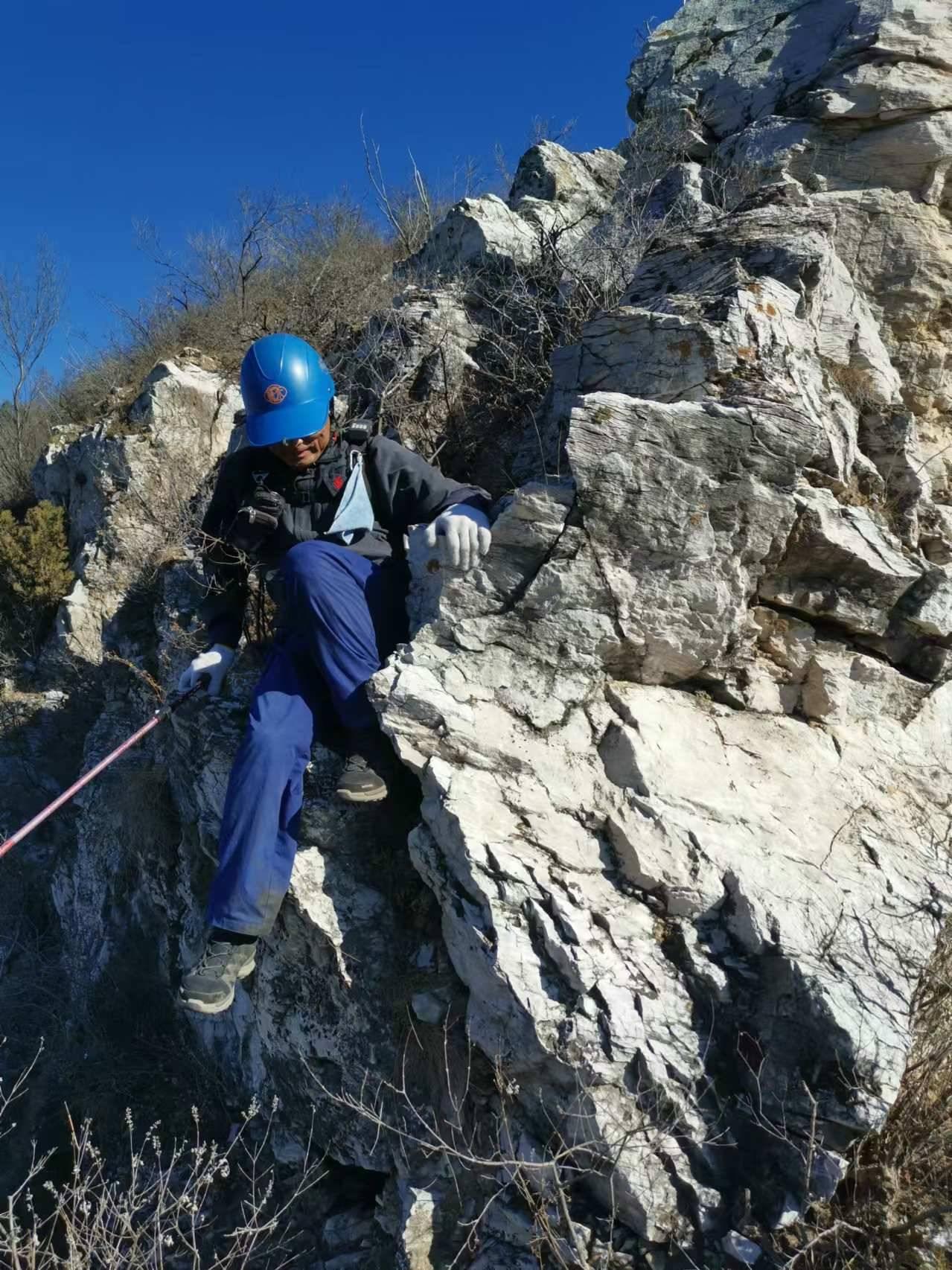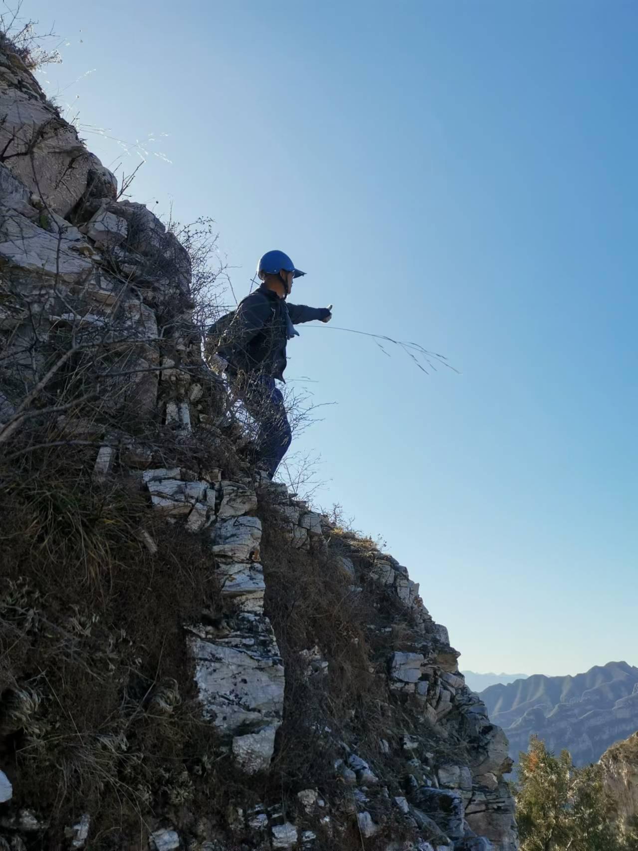 C崖有两处垭口,我分别都去过,但2个垭口之间约100米长我之前没有贯通过。远看山崖陡峭,高约30余米,神甲和自然不畏艰险勇上陡崖,走了三分之二后下不去了,中间有三米陡降断层,无法固定绳子,忻忻然退回。我是认输不上崖,只是绕着这个孤岛崖逆时针一圈就像朝圣一般。