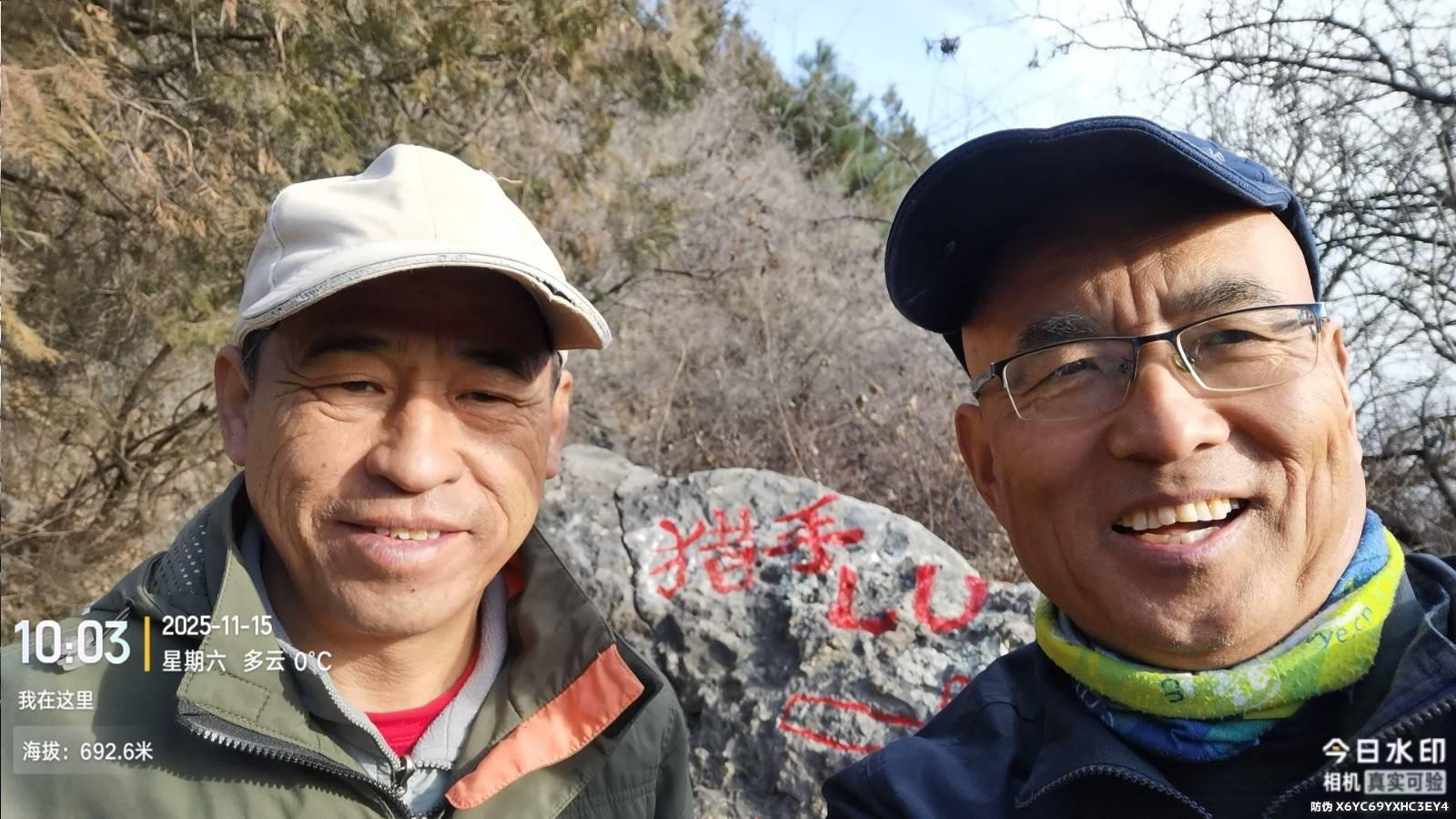 6:55猎手开车到北安河西口公交站接上我,7:05到了管家岭防火站栏杆处广场。8:33到窝棚处核实了猎手路起点,在东侧大石头刻了虚空箭头和“猎手LU”字样,用时75分钟。