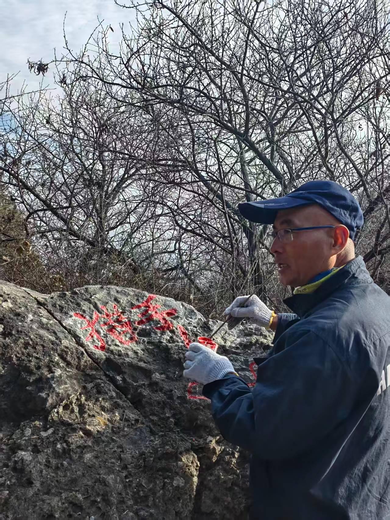 猎手身强力壮,承担了大部分刻石头和几乎全部涂漆工作,否则我一天完成任务很吃力,因为今天猎手字体高50厘米,工作量极大,又增加了一个弓箭图标。14:47完成任务。此处用时共3小时又50分钟。猎手路全长1140米。