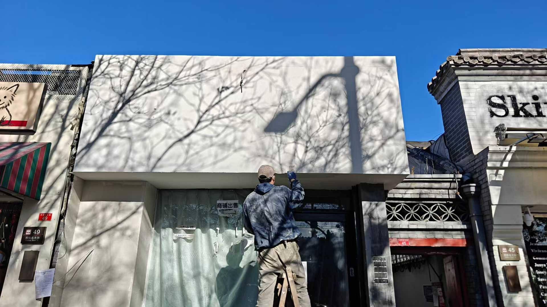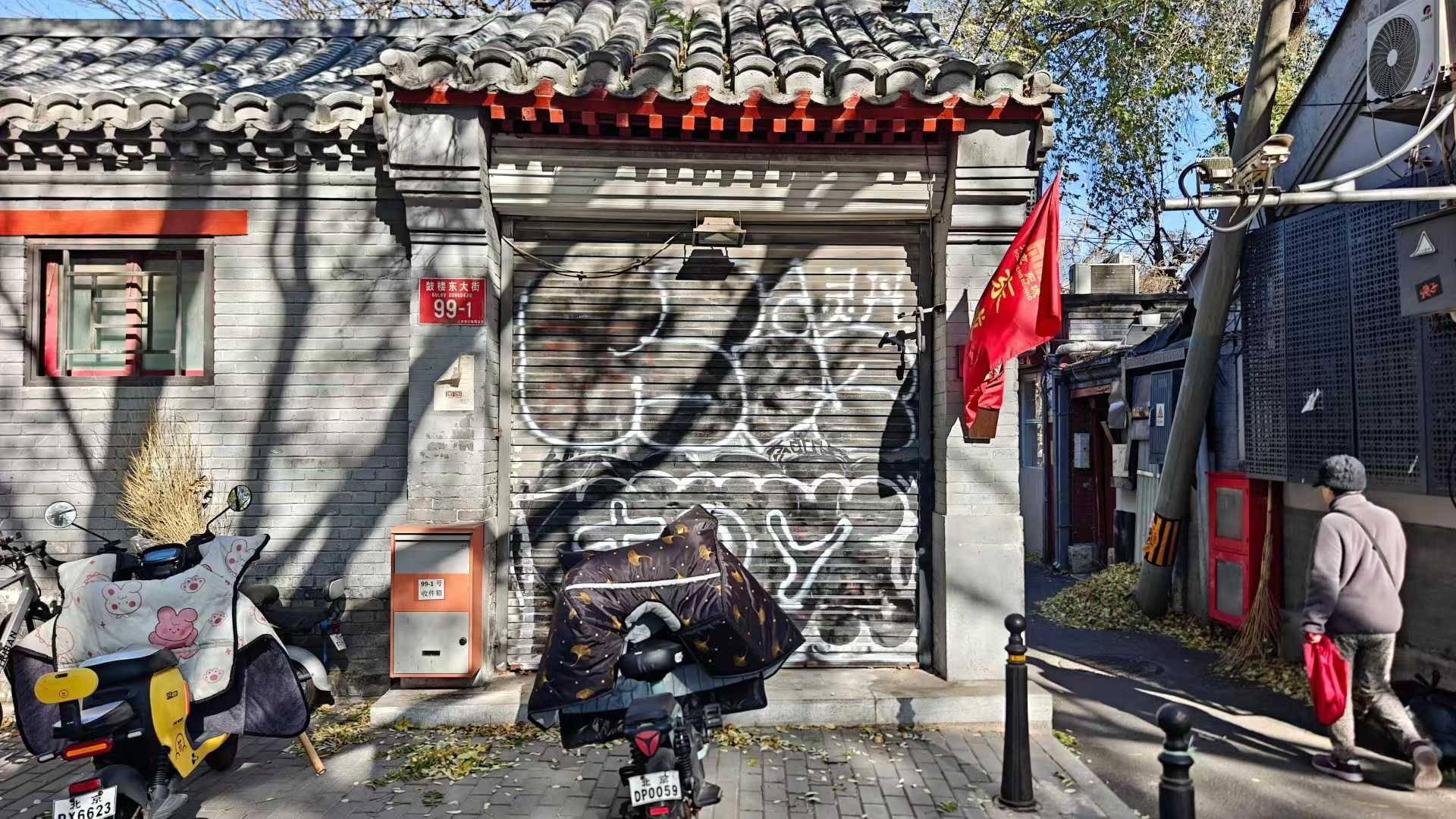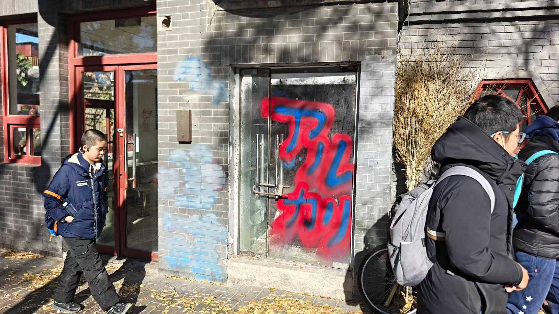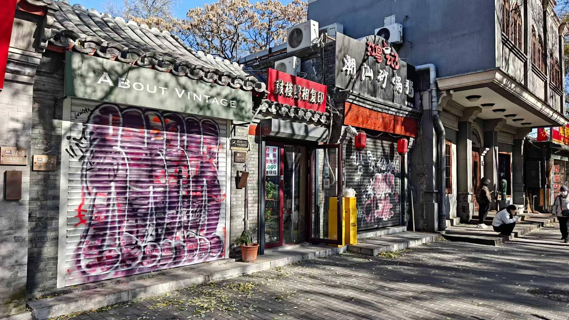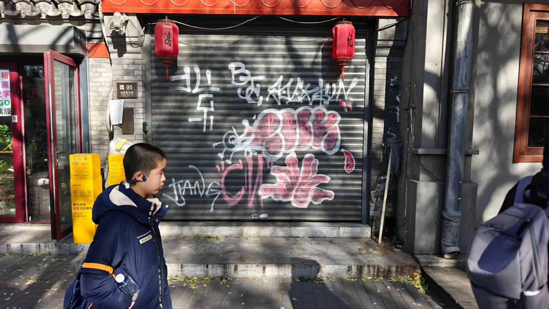 街边小店很多没有开门。鼓楼大街上的店铺,很多卷帘门上的涂鸦,明晃晃地显露出来。