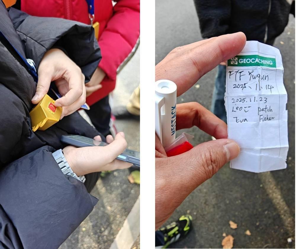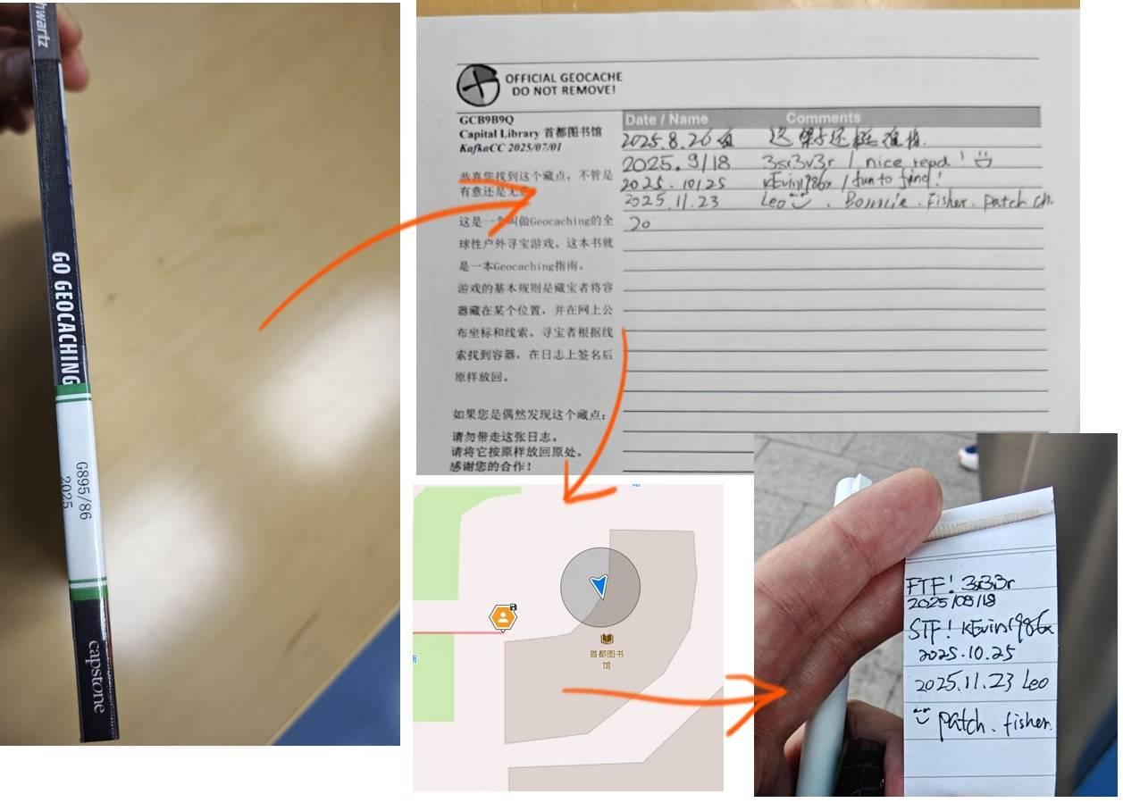 今天首图的多阶段宝是个全新形式,吸引了两个新来的小朋友和他们的家庭。大家在少儿外文阅览室的G8书架周围汇合,话不多说就开始找书。书架上的书比较乱,找了半天终于找到,是一本介绍Geocaching的书,里面夹着线索纸条,有我们下一步的寻找坐标。根据这个最终坐标,出图书馆顺利找到。