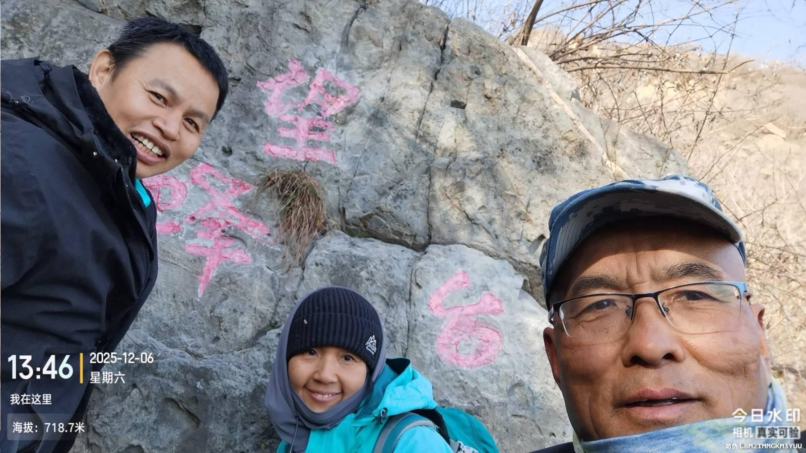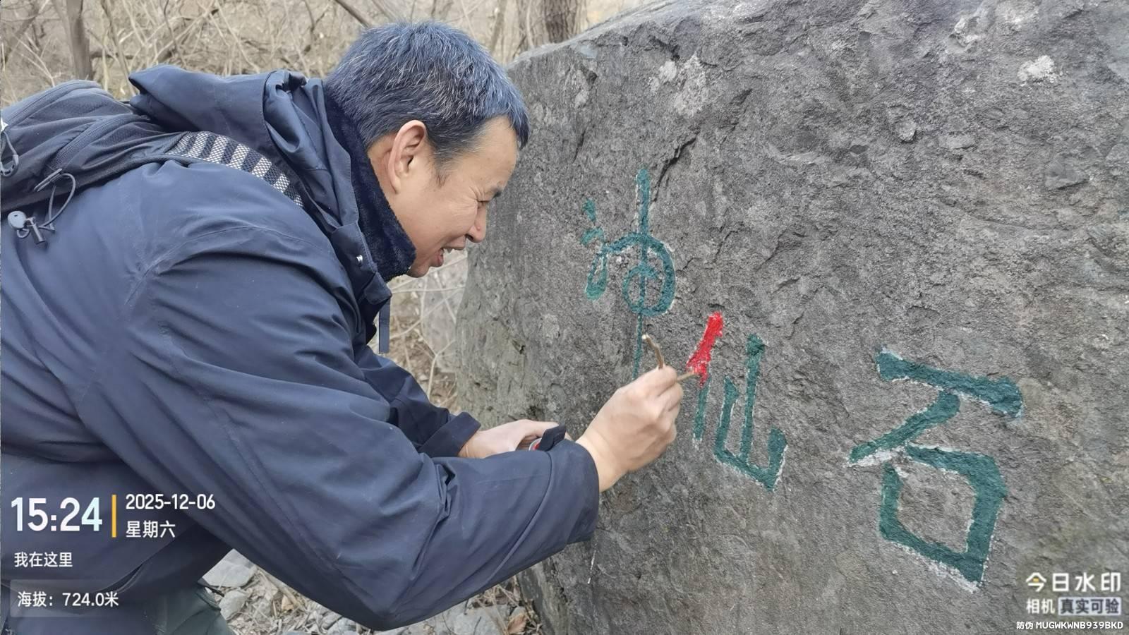 14:45结束刻字,正赶上鹰哥下山,合影留念。山人半路提前回家,一路石头上留下很多白色箭头。我和杨家具和胡林走了小双路,在神仙石处停留,把“仙”字描红,以吸引人注意省的错过。