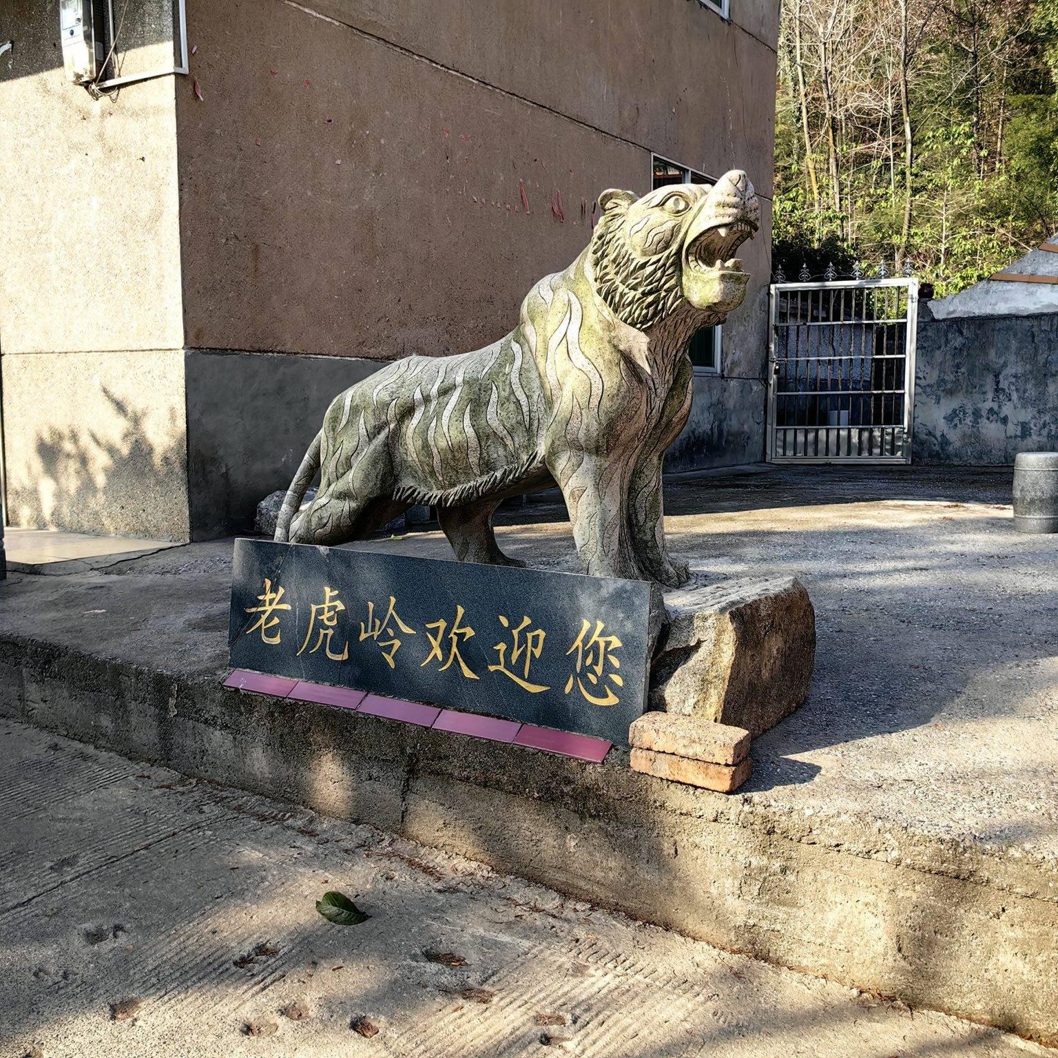 而当我看到一个老虎雕塑座上写着“欢迎来到老虎岭”时,觉得这个老虎岭真的算得上名符其实了,这是我今天38公里行程中海拔最高点,也是行程中最没底的一个岭。因为岭上被一个超大型养殖场圈住了,好不容易才下山。